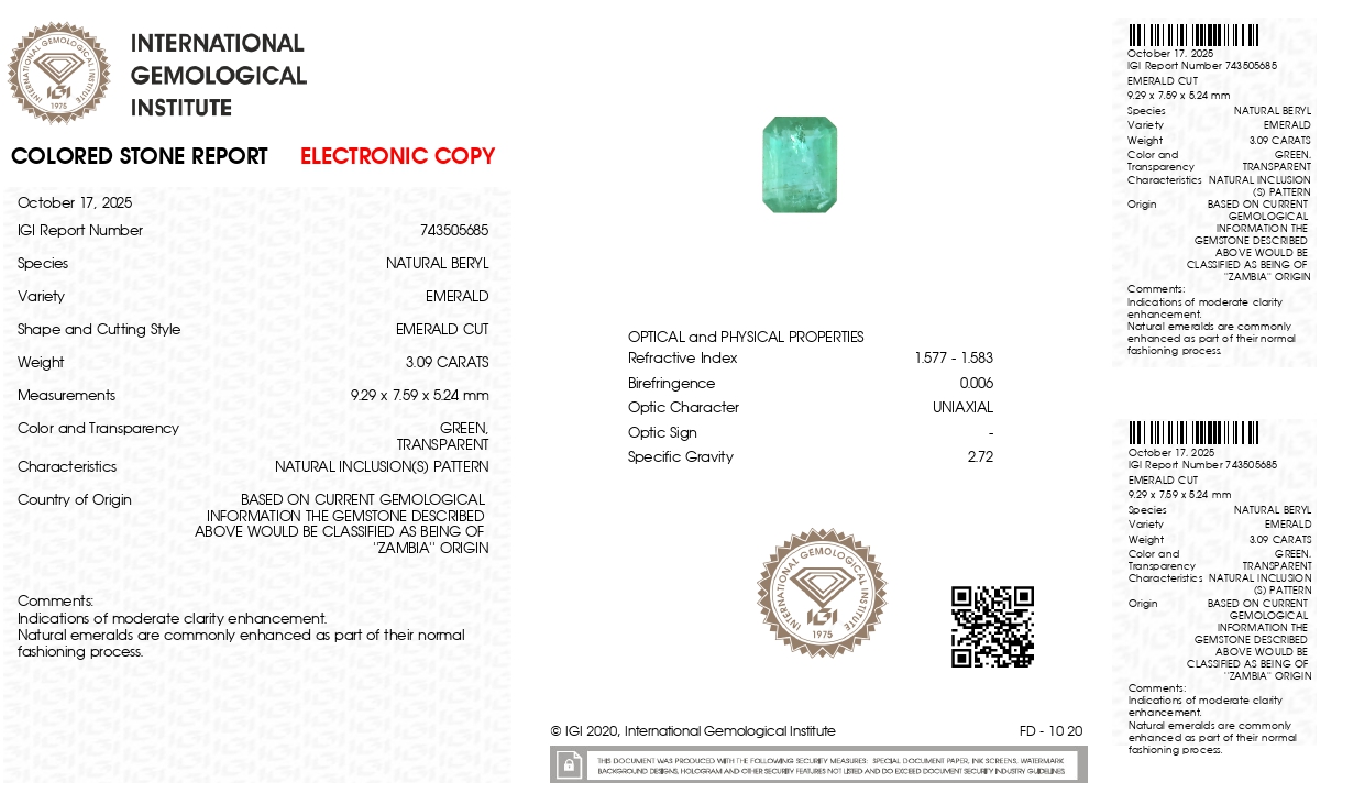 Buy one beautiful transparent 3.09 Carat/ 3.40 Ratti original Emerald online. It has a emerald cut shape and a clarity grade of eye clean (evaluated at eye level), medium Green color intensity, and an excellent polish. The origin of this emerald is Zambia. This emerald stone is unheated & untreated and certified from IGI Govt. Lab.