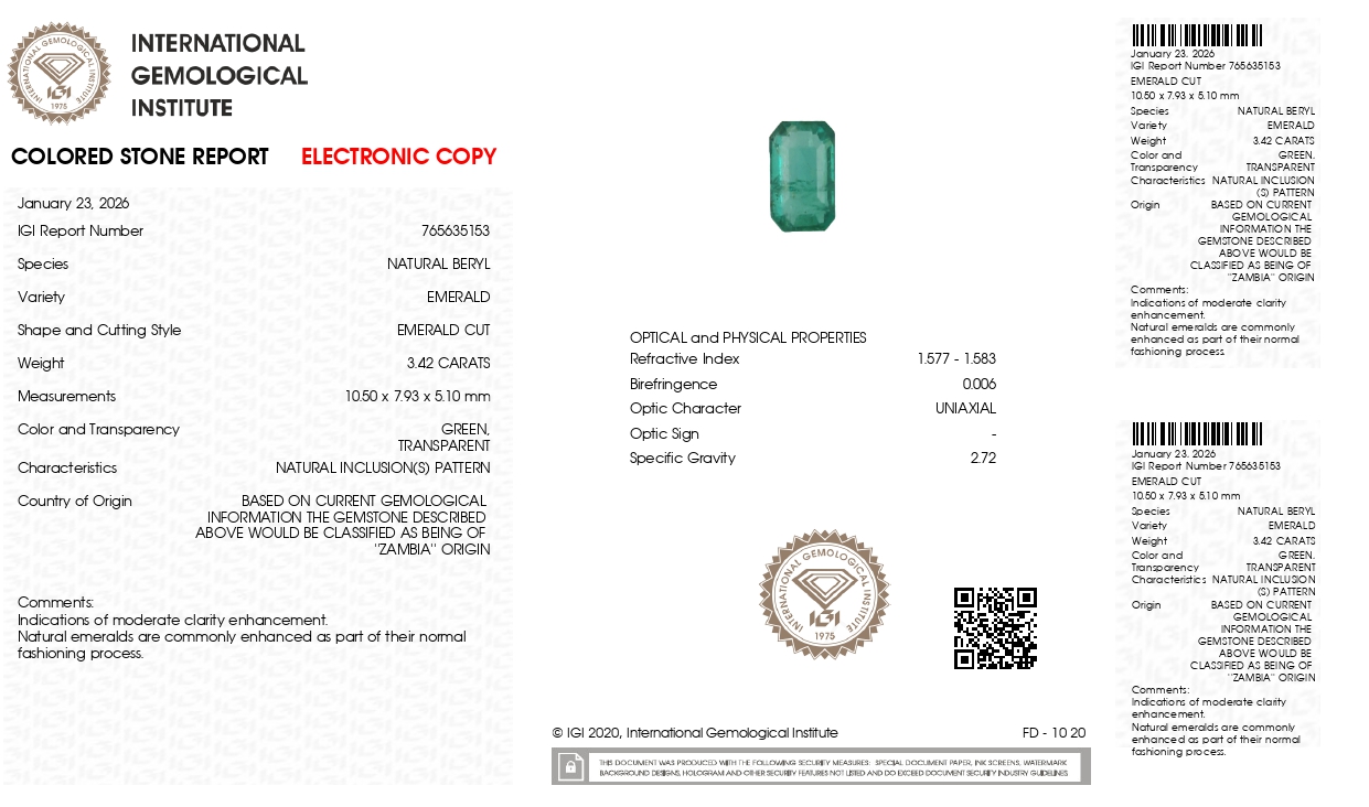 Buy one beautiful tranparent 3.42 Carat/ 3.76 Ratti original Emerald online. It has a Emerald cut shape and a clarity grade of eye clean (evaluated at eye level), medium Green color intensity, and an excellent polish. The origin of this emerald is Zambia. This emerald stone is unheated & untreated and certified from IGI Govt. lab.
