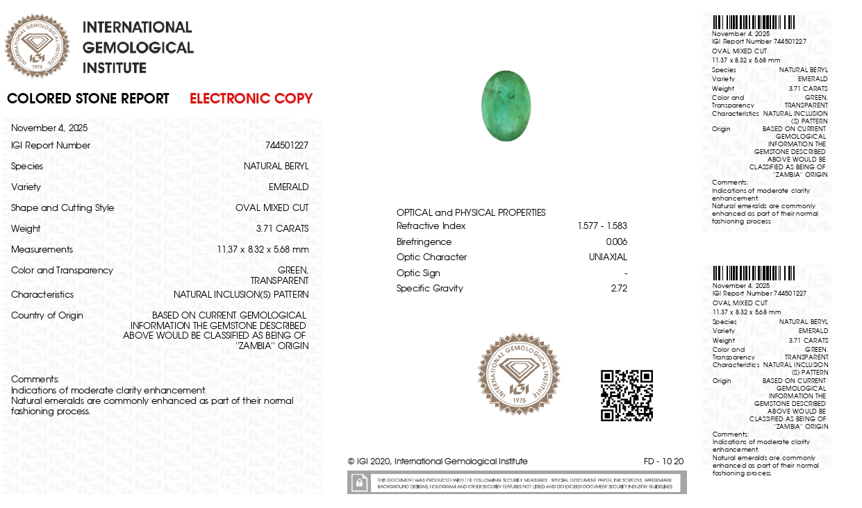 Buy one beautiful transparent 3.71 Carat/ 4.08 Ratti original Emerald online. It has a oval shape and a clarity grade of eye clean (evaluated at eye level), medium Green color intensity, and an excellent polish. The origin of this emerald is Zambia. This emerald stone is unheated & untreated and certified from IGI Govt. lab.