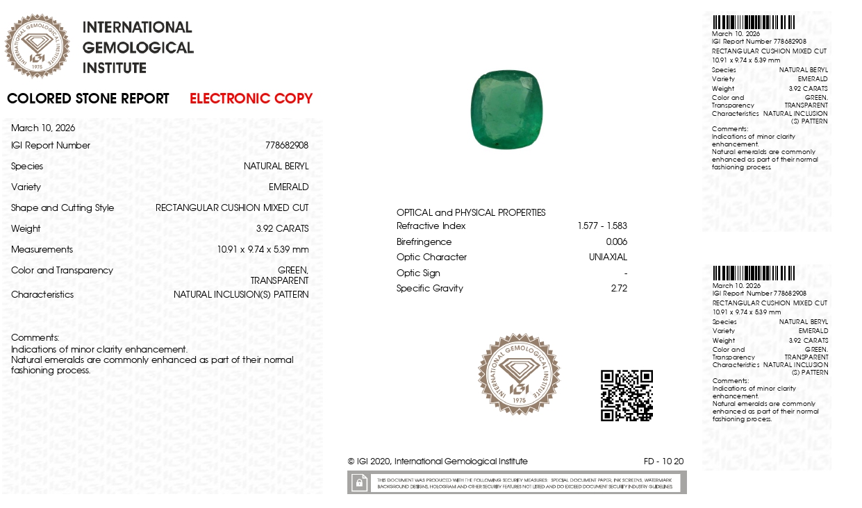 Buy one beautiful tranparent 3.92 Carat/ 4.31 Ratti original Emerald online. It has a Rectangular cushion shape and a clarity grade of eye clean (evaluated at eye level), medium Green color intensity, and an excellent polish. The origin of this emerald is Zambia. This emerald stone is unheated & untreated and certified from IGI Govt. lab.