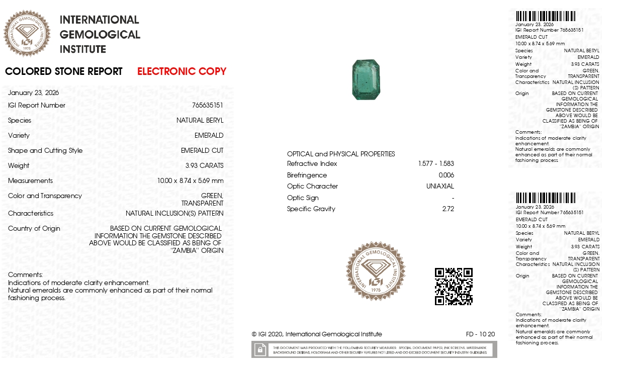 Buy one beautiful tranparent 3.93 Carat/ 4.32 Ratti original Emerald online. It has a Emerald cut shape and a clarity grade of eye clean (evaluated at eye level), medium Green color intensity, and an excellent polish. The origin of this emerald is Zambia. This emerald stone is unheated & untreated and certified from IGI Govt. lab.