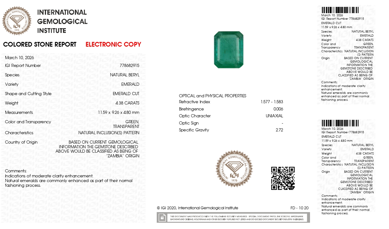 Buy one beautiful tranparent 4.38 Carat/ 4.81 Ratti original Emerald online. It has a Emerald cut shape and a clarity grade of eye clean (evaluated at eye level), medium Green color intensity, and an excellent polish. The origin of this emerald is Zambia. This emerald stone is unheated & untreated and certified from IGI Govt. lab.