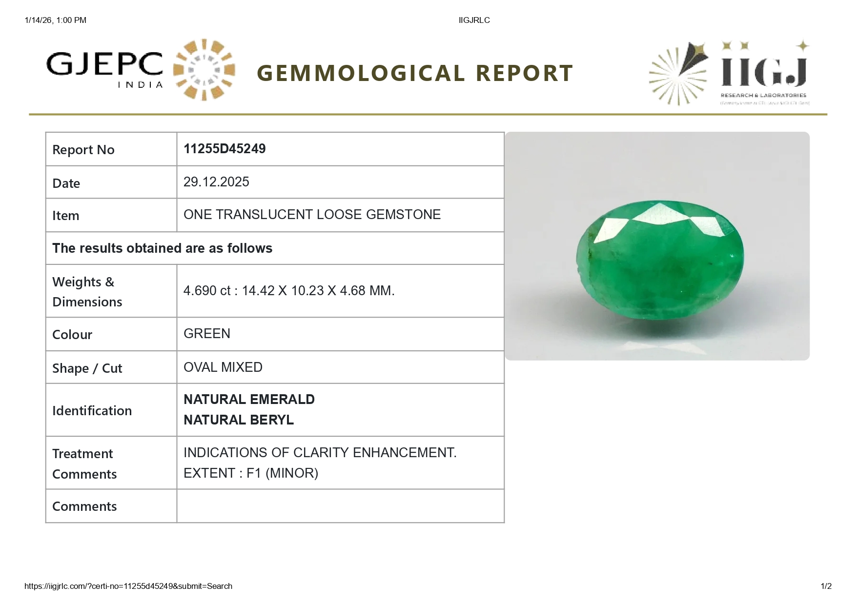 Buy one beautiful translucent 4.69 Carat/ 5.15 Ratti original Emerald online. It has a Oval shape and a clarity grade of eye clean (evaluated at eye level), medium Green color intensity, and an excellent polish. The origin of this emerald is Zambia. This emerald stone is unheated & untreated and certified from IIGJ Govt. lab.