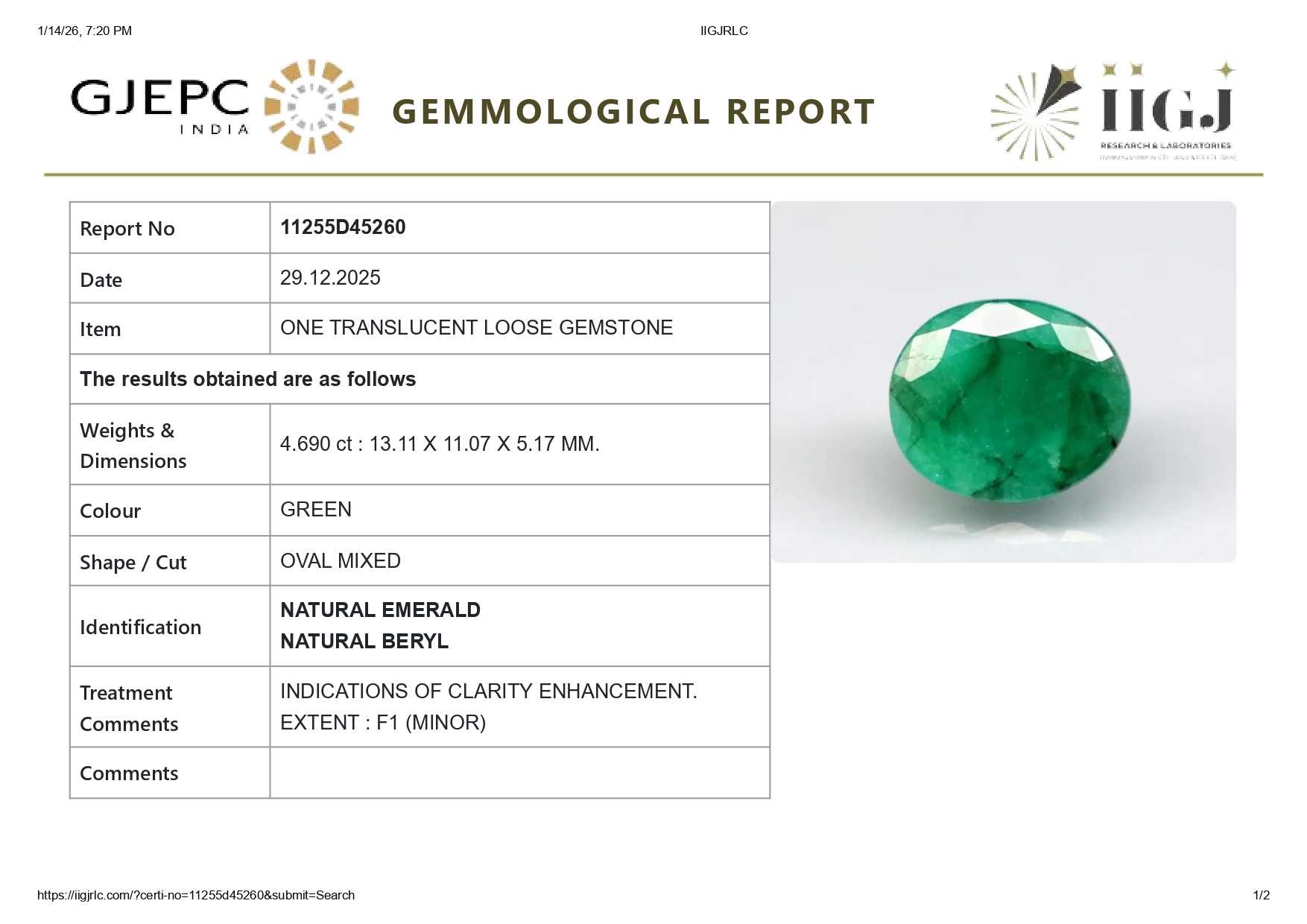 Buy one beautiful translucent 4.69 Carat/ 5.15 Ratti original Emerald online. It has a Oval shape and a clarity grade of eye clean (evaluated at eye level), medium Green color intensity, and an excellent polish. The origin of this emerald is Zambia. This emerald stone is unheated & untreated and certified from IIGJ Govt. lab.