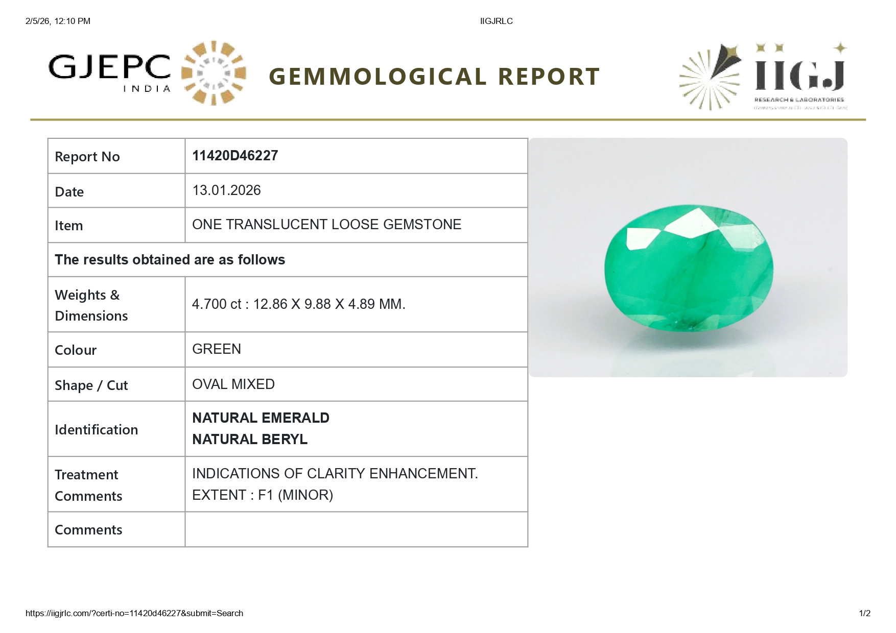 Buy one beautiful translucent 4.70 Carat/ 5.16 Ratti original Emerald online. It has a Oval shape and a clarity grade of eye clean (evaluated at eye level), medium Green color intensity, and an excellent polish. The origin of this emerald is Zambia. This emerald stone is unheated & untreated and certified from IIGJ Govt. lab.