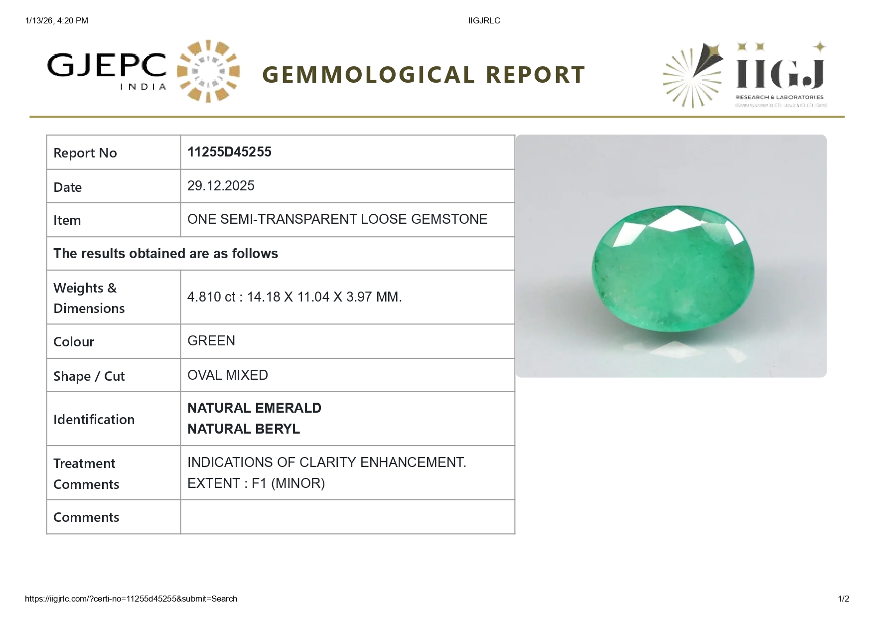 Buy one beautiful translucent 4.81 Carat/ 5.29 Ratti original Emerald online. It has a Oval shape and a clarity grade of eye clean (evaluated at eye level), medium Green color intensity, and an excellent polish. The origin of this emerald is Zambia. This emerald stone is unheated & untreated and certified from IIGJ Govt. lab.