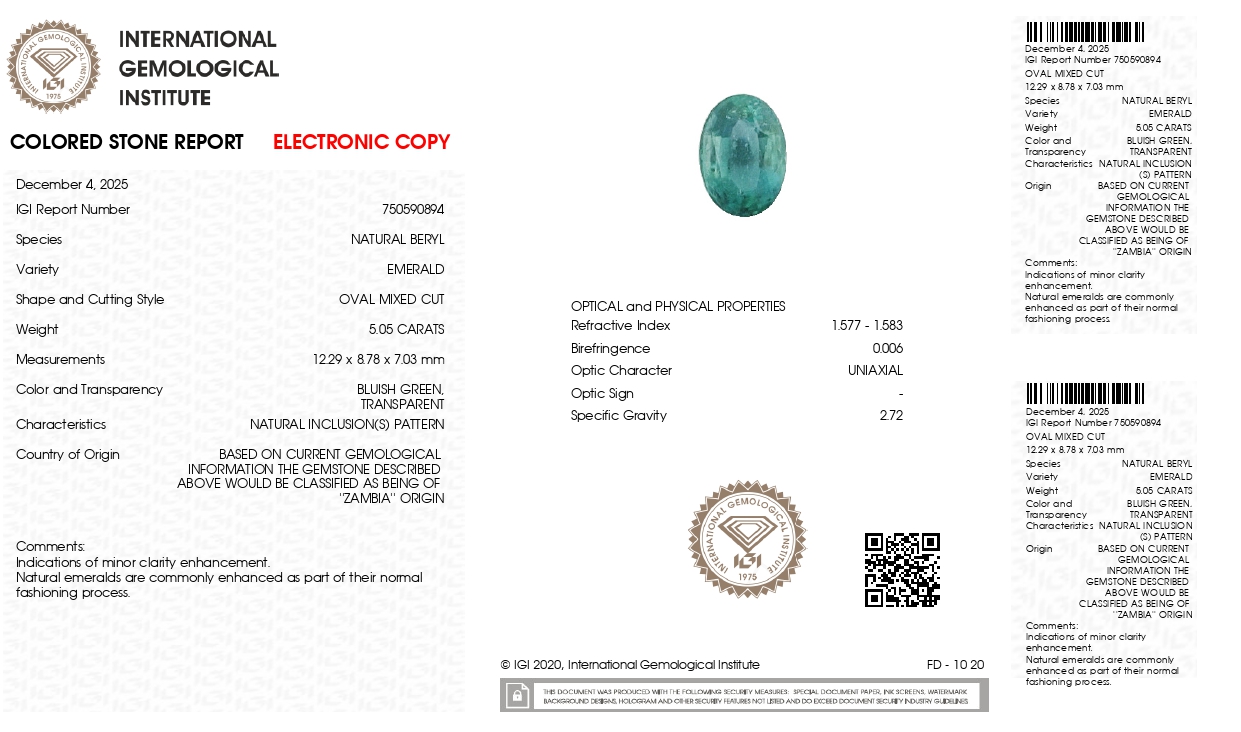 Buy one beautiful transparent 5.05 Carat/ 5.55 Ratti original Emerald online. It has a Oval shape and a clarity grade of eye clean (evaluated at eye level), medium Green color intensity, and an excellent polish. The origin of this emerald is Zambia. This emerald stone is unheated & untreated and certified from IGI Govt. lab.