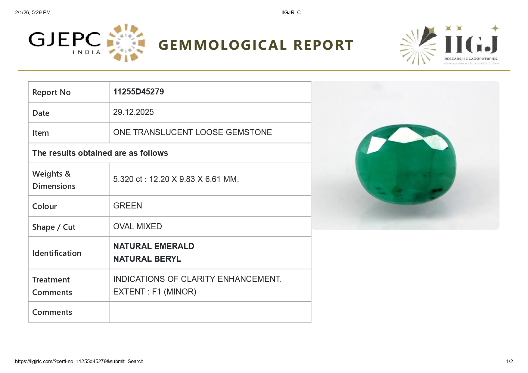 Buy one beautiful translucent 5.32 Carat/ 5.85 Ratti original Emerald online. It has a Oval shape and a clarity grade of eye clean (evaluated at eye level), medium Green color intensity, and an excellent polish. The origin of this emerald is Zambia. This emerald stone is unheated & untreated and certified from IIGJ Govt. lab.