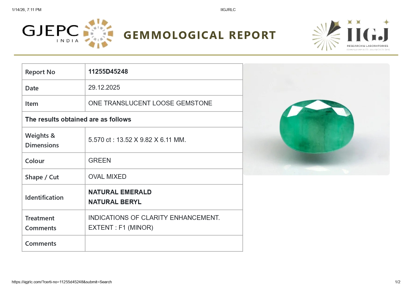 Buy one beautiful translucent 5.57 Carat/ 6.12 Ratti original Emerald online. It has a Oval shape and a clarity grade of eye clean (evaluated at eye level), medium Green color intensity, and an excellent polish. The origin of this emerald is Zambia. This emerald stone is unheated & untreated and certified from IIGJ Govt. lab.