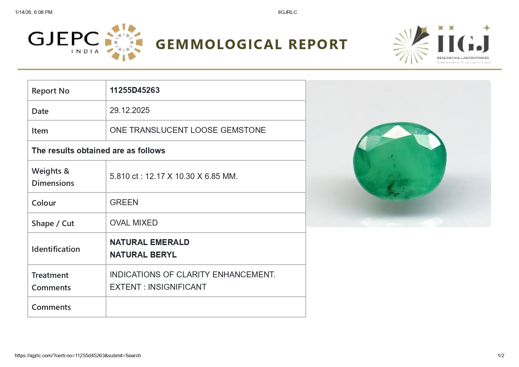 Buy one beautiful translucent 5.81 Carat/ 6.38 Ratti original Emerald online. It has a Oval shape and a clarity grade of eye clean (evaluated at eye level), medium Green color intensity, and an excellent polish. The origin of this emerald is Zambia. This emerald stone is unheated & untreated and certified from IIGJ Govt. lab.