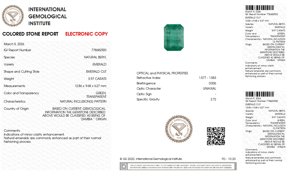 Buy one beautiful tranparent 5.97 Carat/ 6.56 Ratti original Emerald online. It has a Emerald cut shape and a clarity grade of eye clean (evaluated at eye level), medium Green color intensity, and an excellent polish. The origin of this emerald is Zambia. This emerald stone is unheated & untreated and certified from IGI Govt. lab.