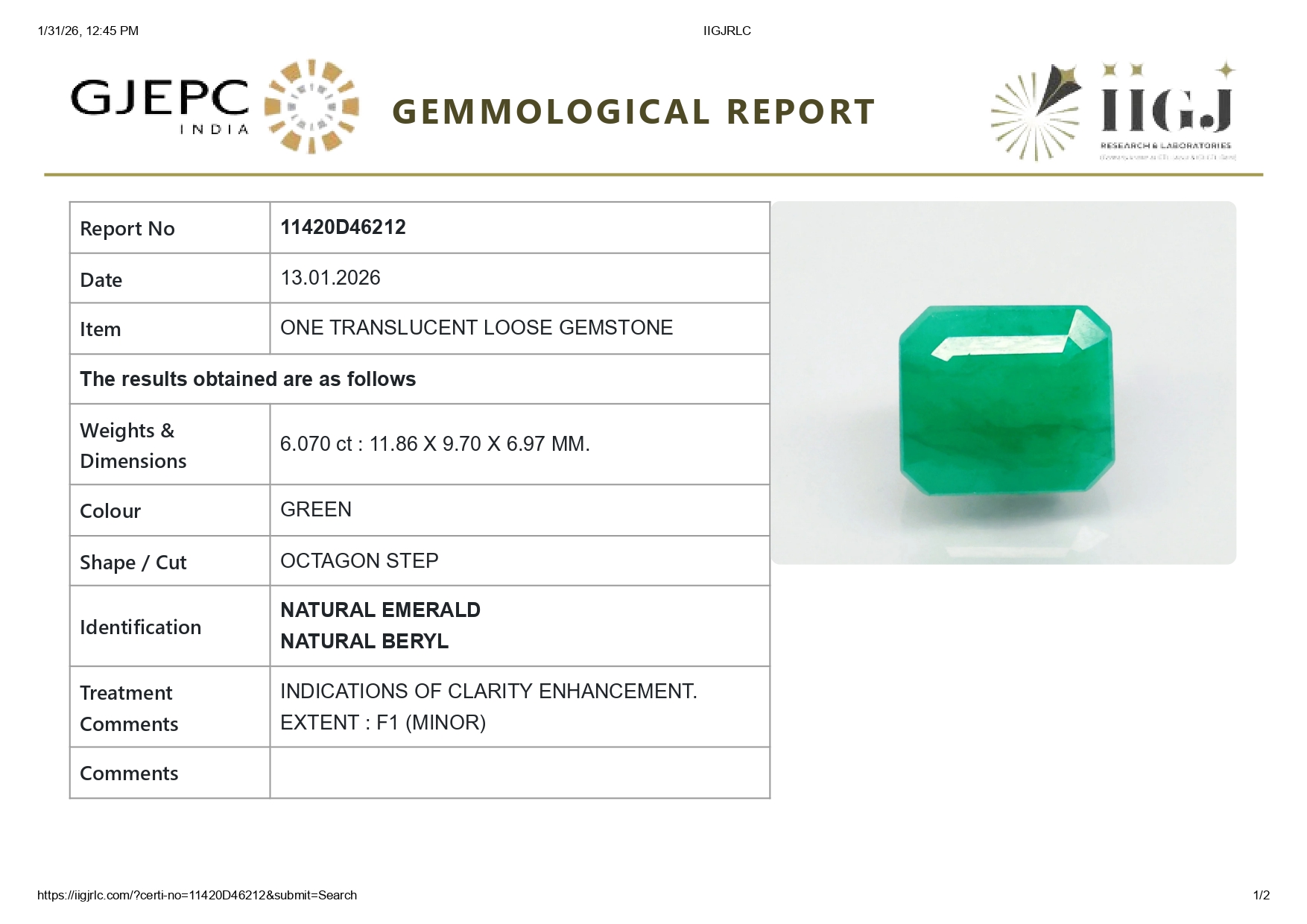 Buy one beautiful translucent 6.07 Carat/ 6.67 Ratti original Emerald online. It has a Emerald cut shape and a clarity grade of eye clean (evaluated at eye level), medium Green color intensity, and an excellent polish. The origin of this emerald is Zambia. This emerald stone is unheated & untreated and certified from IIGJ Govt. lab.