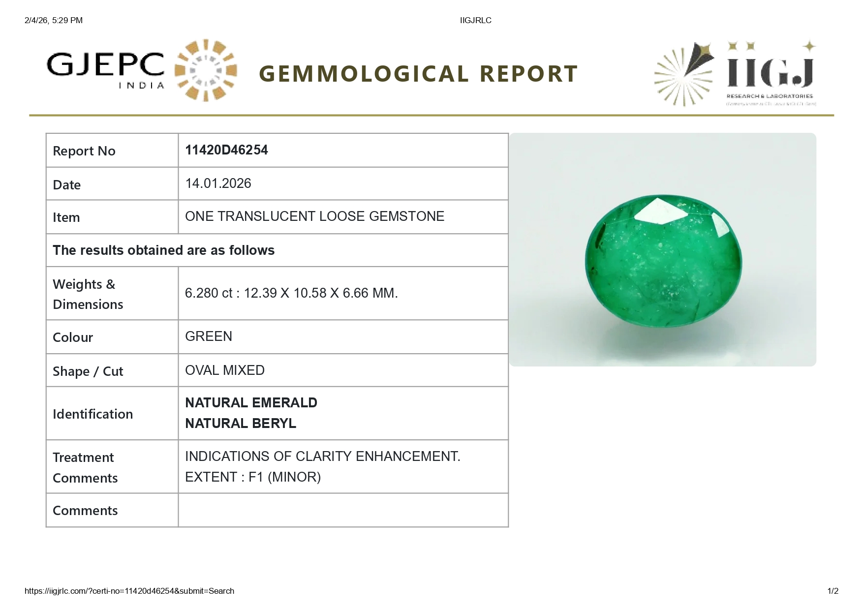 Buy one beautiful translucent 6.28 Carat/ 6.90 Ratti original Emerald online. It has a Oval shape and a clarity grade of eye clean (evaluated at eye level), medium Green color intensity, and an excellent polish. The origin of this emerald is Zambia. This emerald stone is unheated & untreated and certified from IIGJ Govt. lab.
