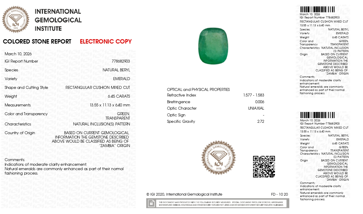 Buy one beautiful tranparent 6.45 Carat/ 7.09 Ratti original Emerald online. It has a rectangular cushion shape and a clarity grade of eye clean (evaluated at eye level), medium Green color intensity, and an excellent polish. The origin of this emerald is Zambia. This emerald stone is unheated & untreated and certified from IGI Govt. lab.
