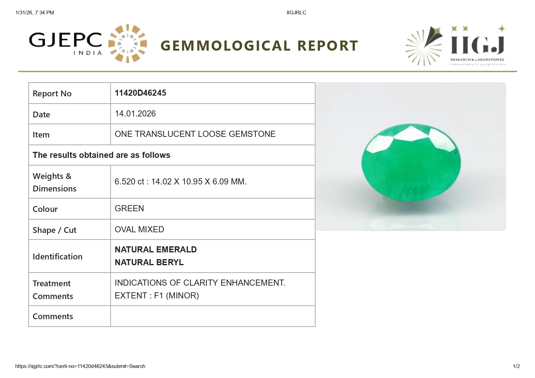 Buy one beautiful translucent 6.52 Carat/ 7.16 Ratti original Emerald online. It has a Oval shape and a clarity grade of eye clean (evaluated at eye level), medium Green color intensity, and an excellent polish. The origin of this emerald is Zambia. This emerald stone is unheated & untreated and certified from IIGJ Govt. lab.