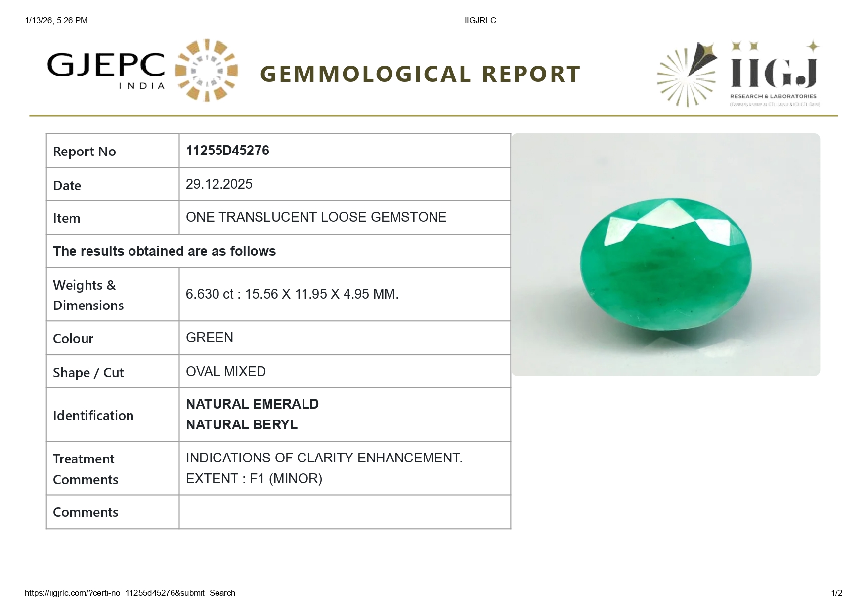 Buy one beautiful translucent 6.63 Carat/ 7.29 Ratti original Emerald online. It has a Oval shape and a clarity grade of eye clean (evaluated at eye level), medium Green color intensity, and an excellent polish. The origin of this emerald is Zambia. This emerald stone is unheated & untreated and certified from IIGJ Govt. lab.