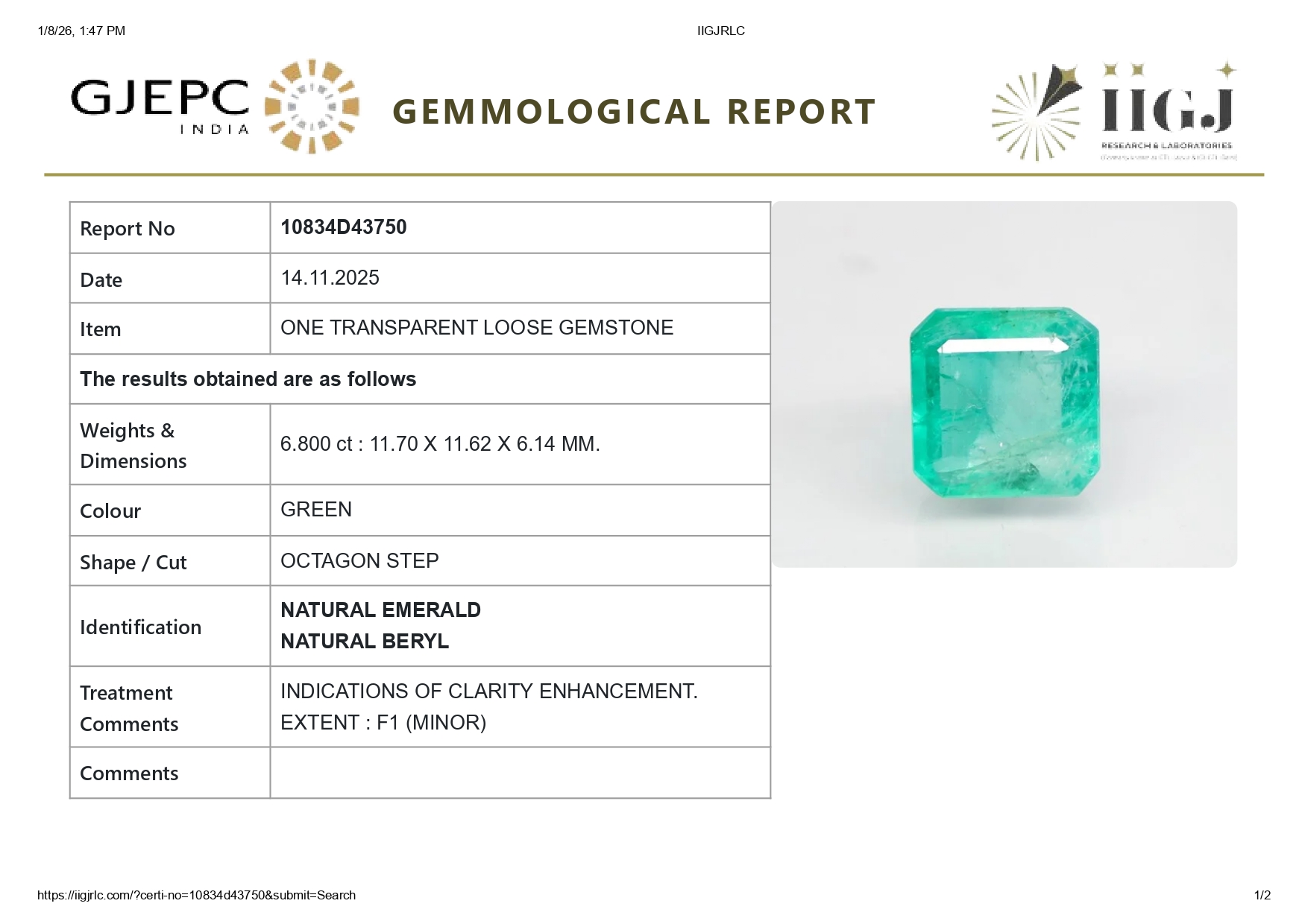 Buy one beautiful transparent 6.80 Carat/ 7.47 Ratti original Emerald online. It has a Octagon shape and a clarity grade of eye clean (evaluated at eye level), medium Green color intensity, and an excellent polish. The origin of this emerald is Zambia. This emerald stone is unheated & untreated and certified from IIGJ Govt. lab.