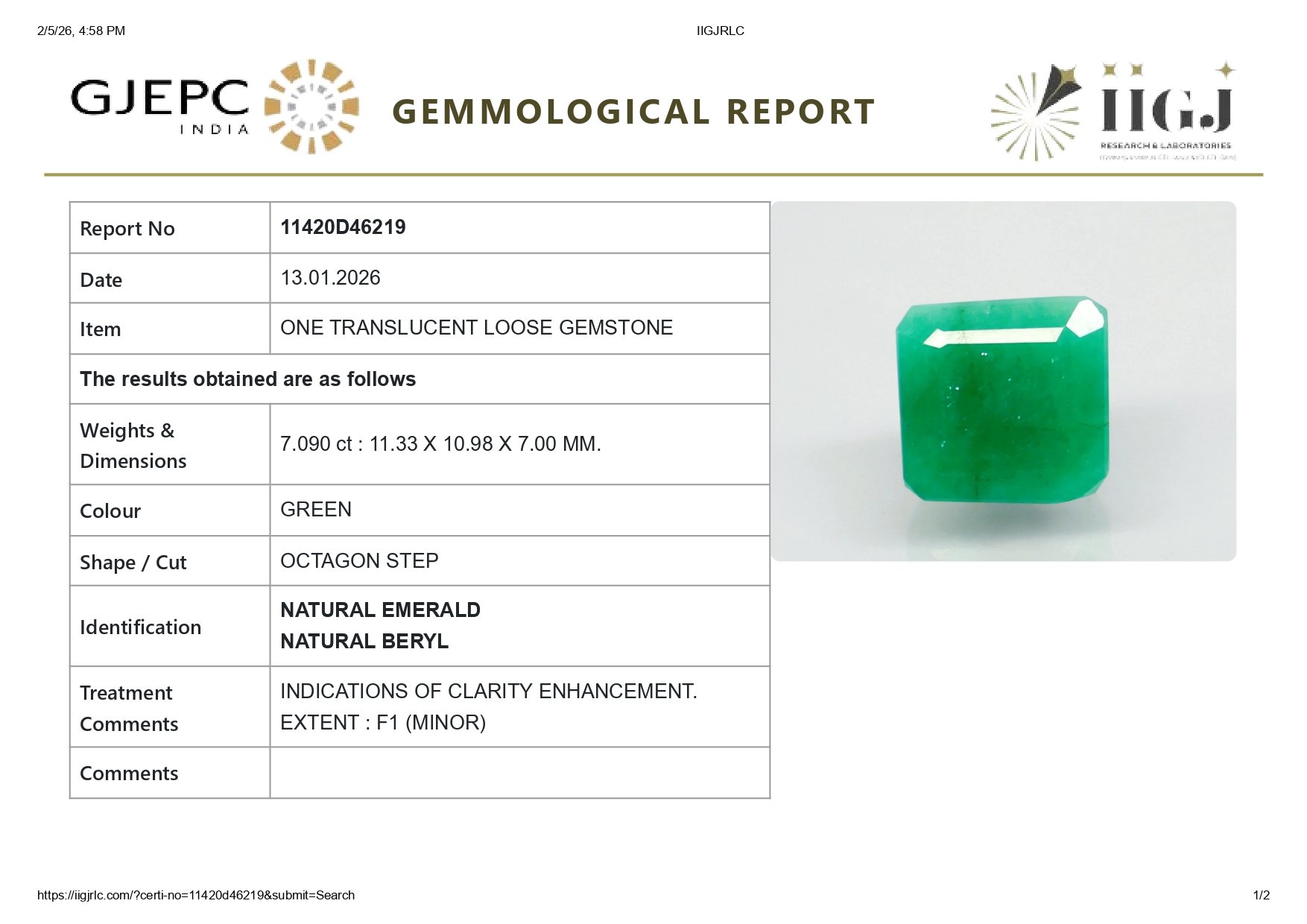 Buy one beautiful translucent 7.09 Carat/ 7.79 Ratti original Emerald online. It has a Octagon shape and a clarity grade of eye clean (evaluated at eye level), medium Green color intensity, and an excellent polish. The origin of this emerald is Zambia. This emerald stone is unheated & untreated and certified from IIGJ Govt. lab.