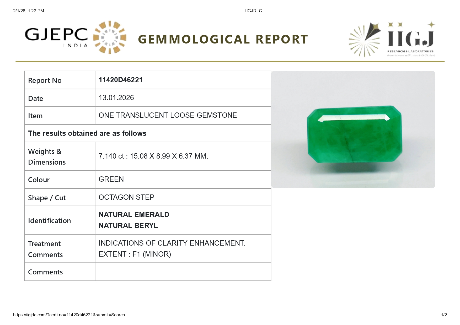 Buy one beautiful translucent 7.14 Carat/ 7.85 Ratti original Emerald online. It has a Emerald cut shape and a clarity grade of eye clean (evaluated at eye level), medium Green color intensity, and an excellent polish. The origin of this emerald is Zambia. This emerald stone is unheated & untreated and certified from IIGJ Govt. lab.