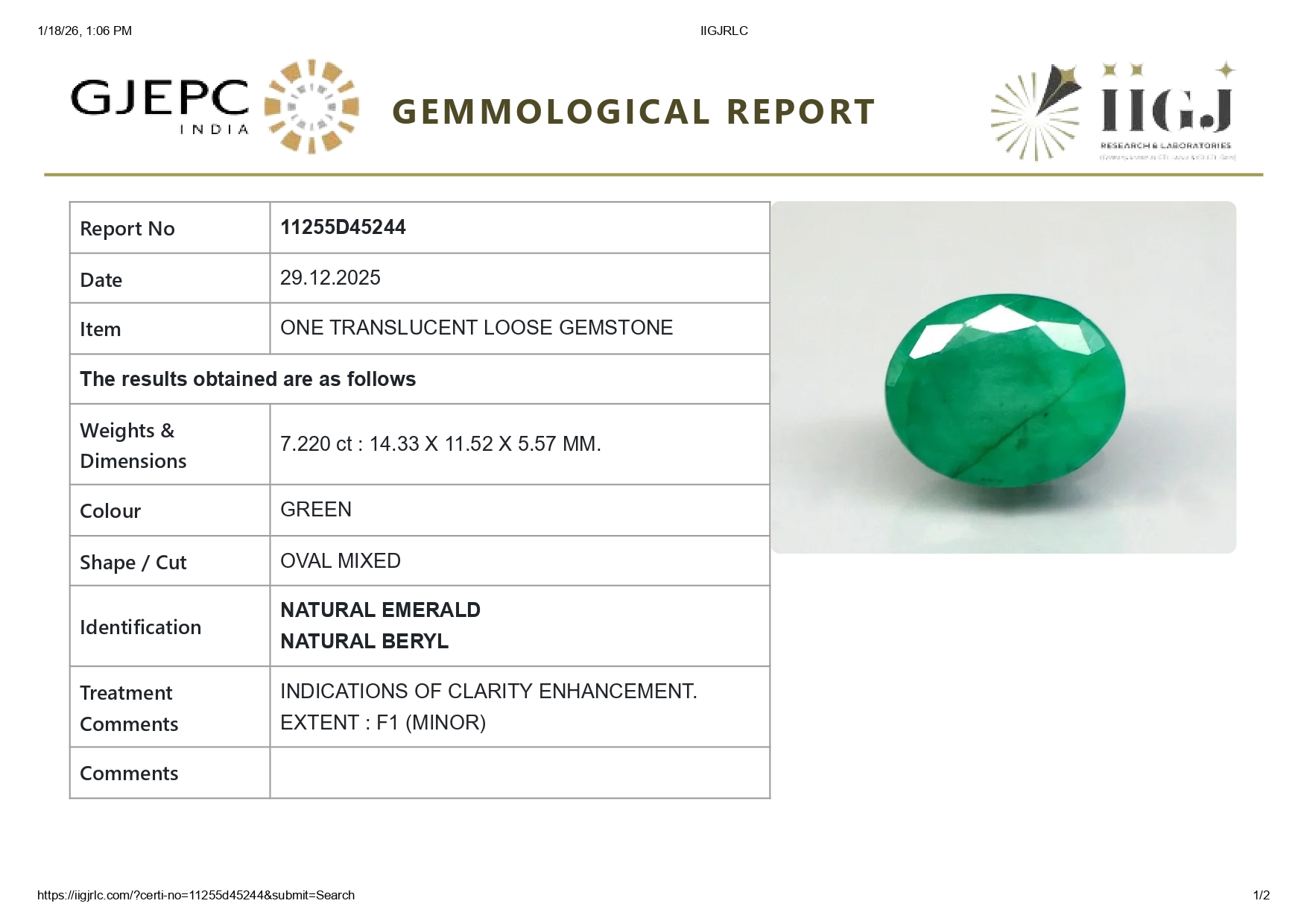Buy one beautiful translucent 7.22 Carat/ 7.93 Ratti original Emerald online. It has a Oval shape and a clarity grade of eye clean (evaluated at eye level), medium Green color intensity, and an excellent polish. The origin of this emerald is Zambia. This emerald stone is unheated & untreated and certified from IIGJ Govt. lab.