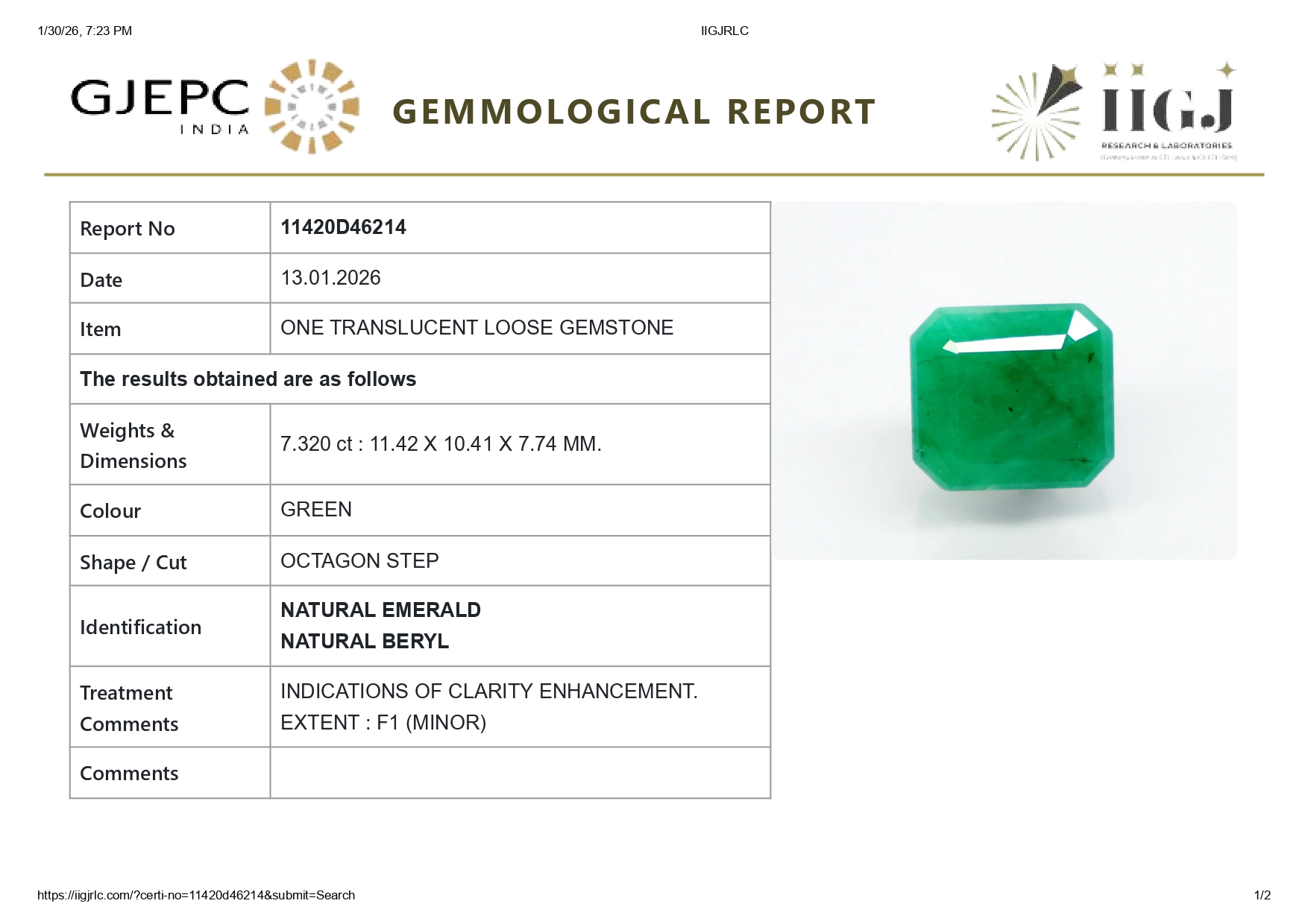 Buy one beautiful translucent 7.32 Carat/ 8.04 Ratti original Emerald online. It has a Emerald cut shape and a clarity grade of eye clean (evaluated at eye level), medium Green color intensity, and an excellent polish. The origin of this emerald is Zambia. This emerald stone is unheated & untreated and certified from IIGJ Govt. lab.