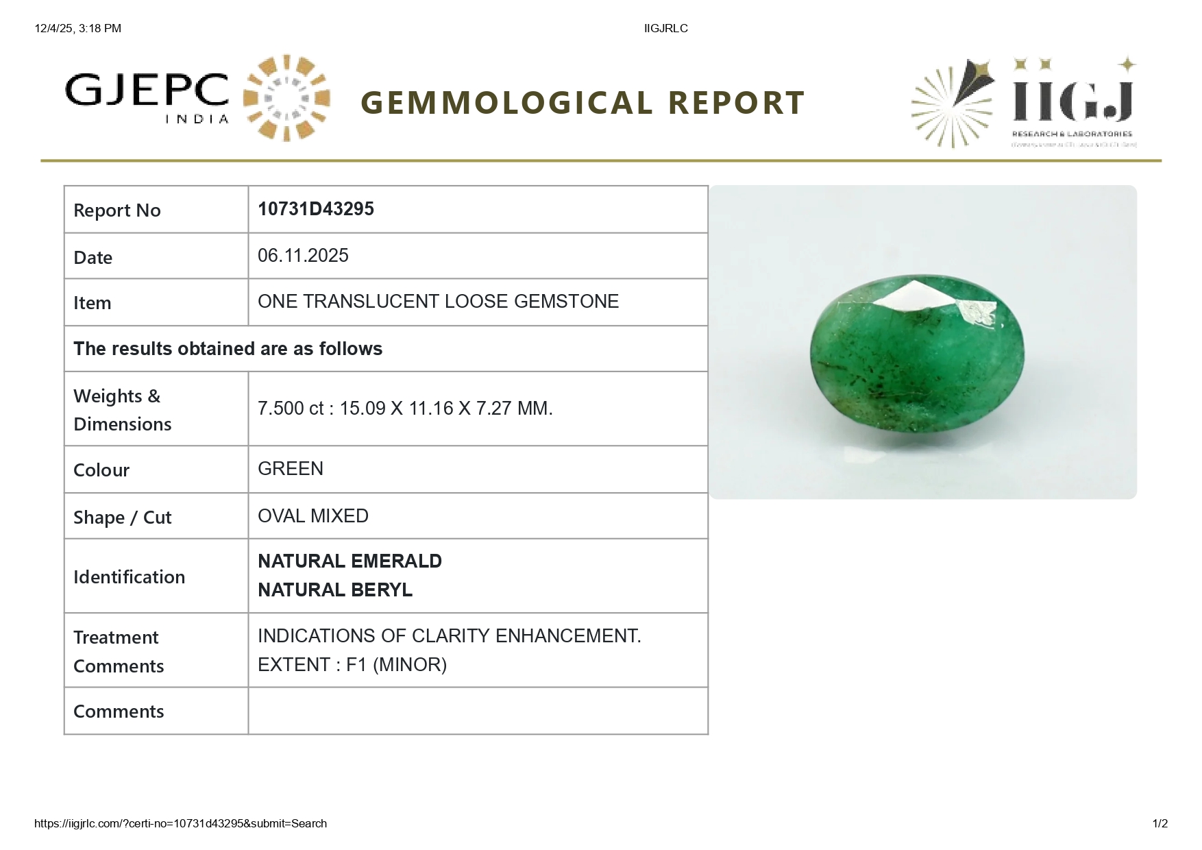 Buy one beautiful transparent 7.50 Carat/ 8.24 Ratti original Emerald online. It has a oval shape and a clarity grade of eye clean (evaluated at eye level), medium Green color intensity, and an excellent polish. The origin of this emerald is Zambia. This emerald stone is unheated & untreated and certified from IIGJ Govt. lab.