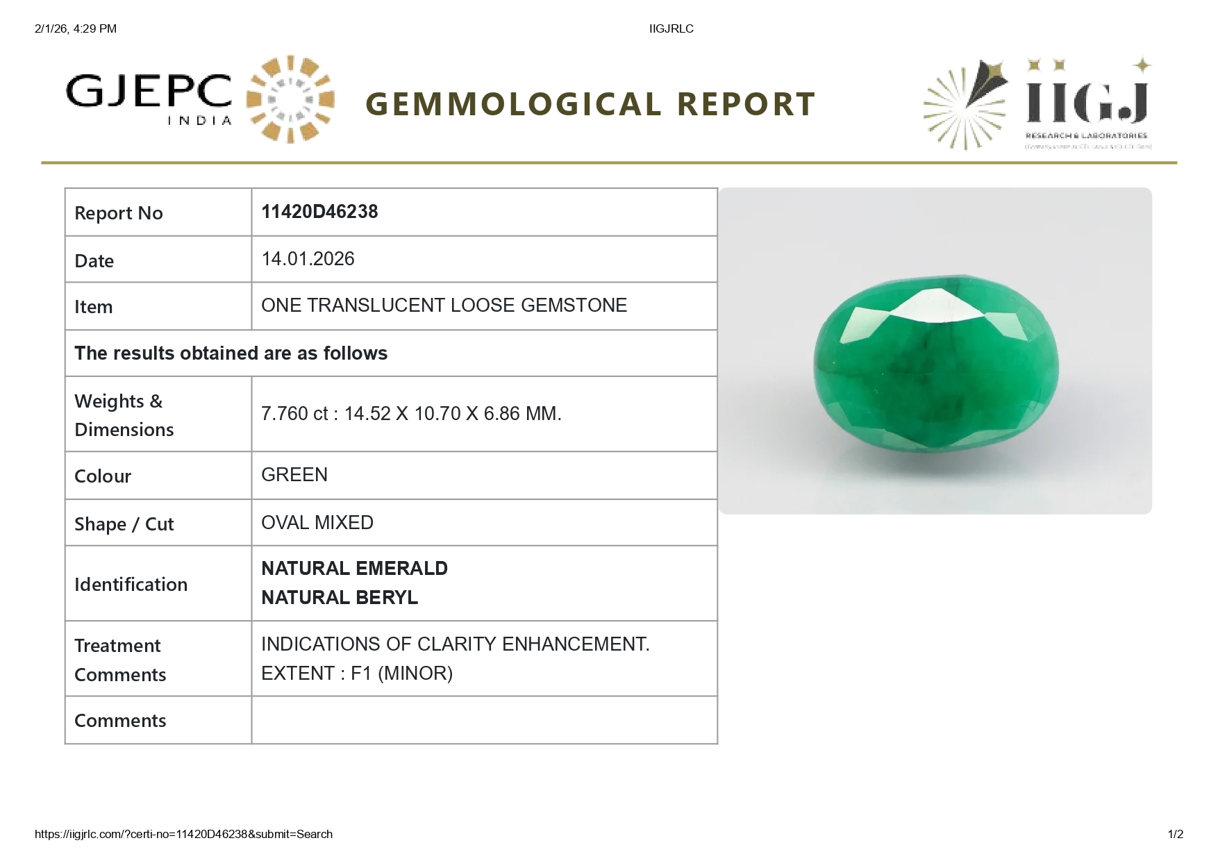 Govt Lab Certified - IIGJ (Formerly -IGI-GTL, Worth 1500/-) Verify