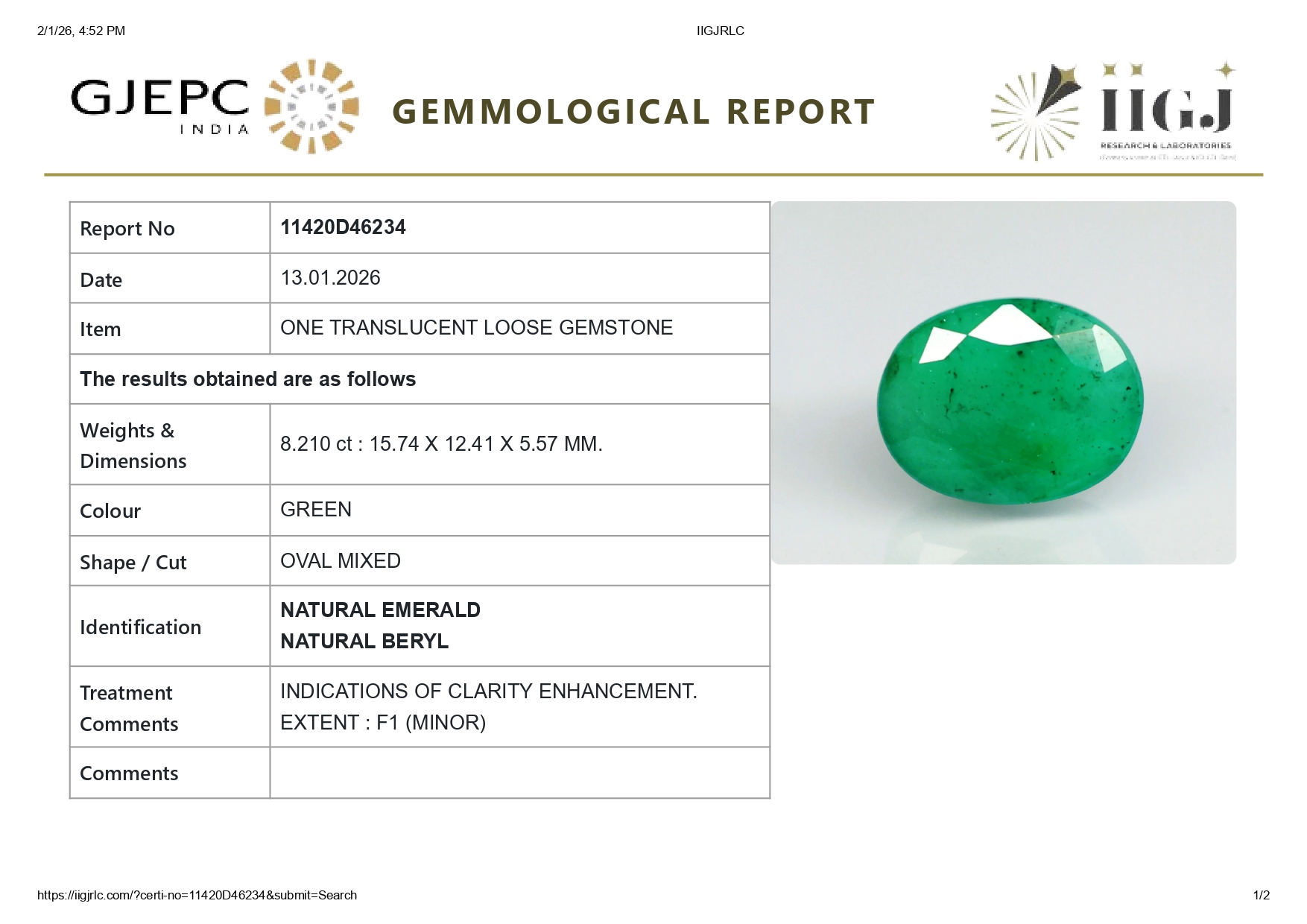 Buy one beautiful translucent 8.21 Carat/ 9.62 Ratti original Emerald online. It has a Oval shape and a clarity grade of eye clean (evaluated at eye level), medium Green color intensity, and an excellent polish. The origin of this emerald is Zambia. This emerald stone is unheated & untreated and certified from IIGJ Govt. lab.