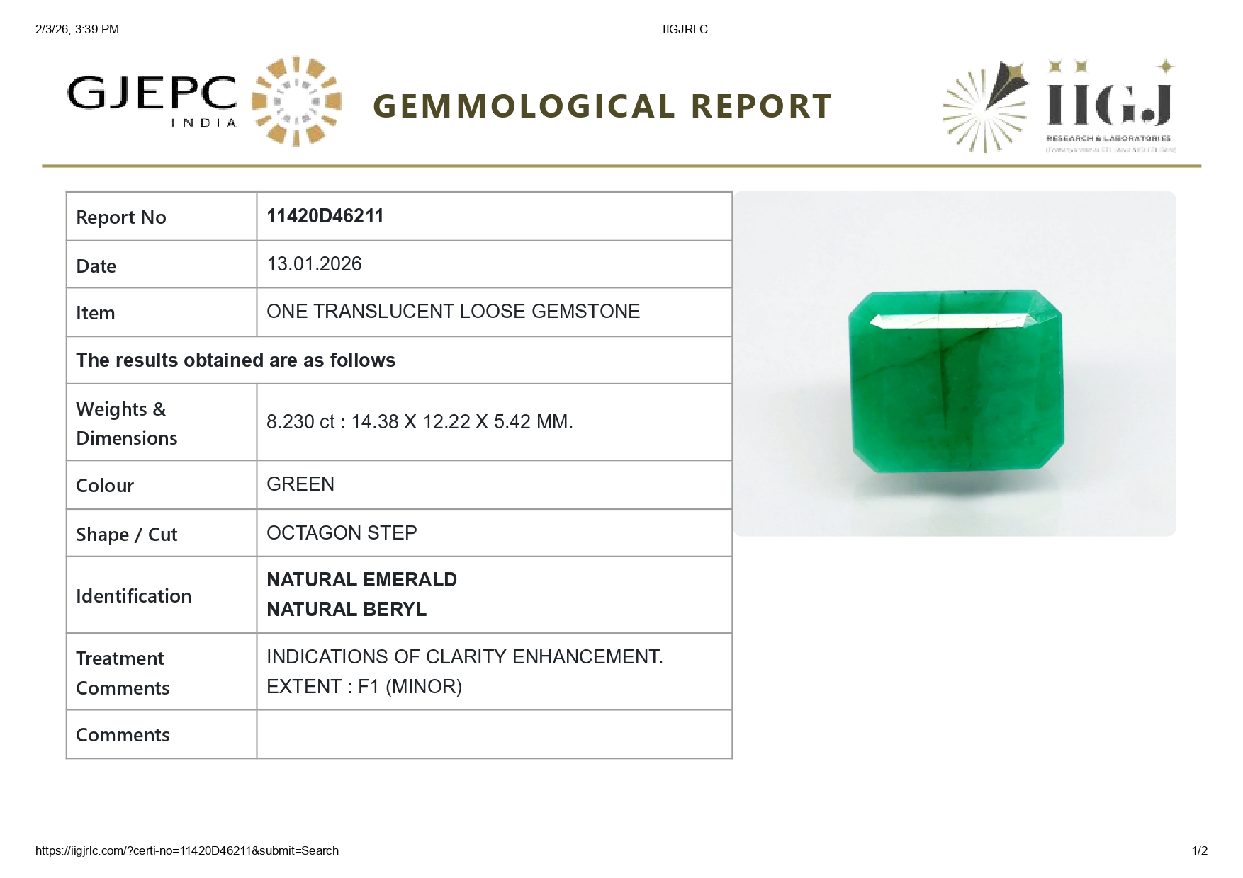 Buy one beautiful translucent 8.23 Carat/ 9.04 Ratti original Emerald online. It has a Octagon shape and a clarity grade of eye clean (evaluated at eye level), medium Green color intensity, and an excellent polish. The origin of this emerald is Zambia. This emerald stone is unheated & untreated and certified from IIGJ Govt. lab.