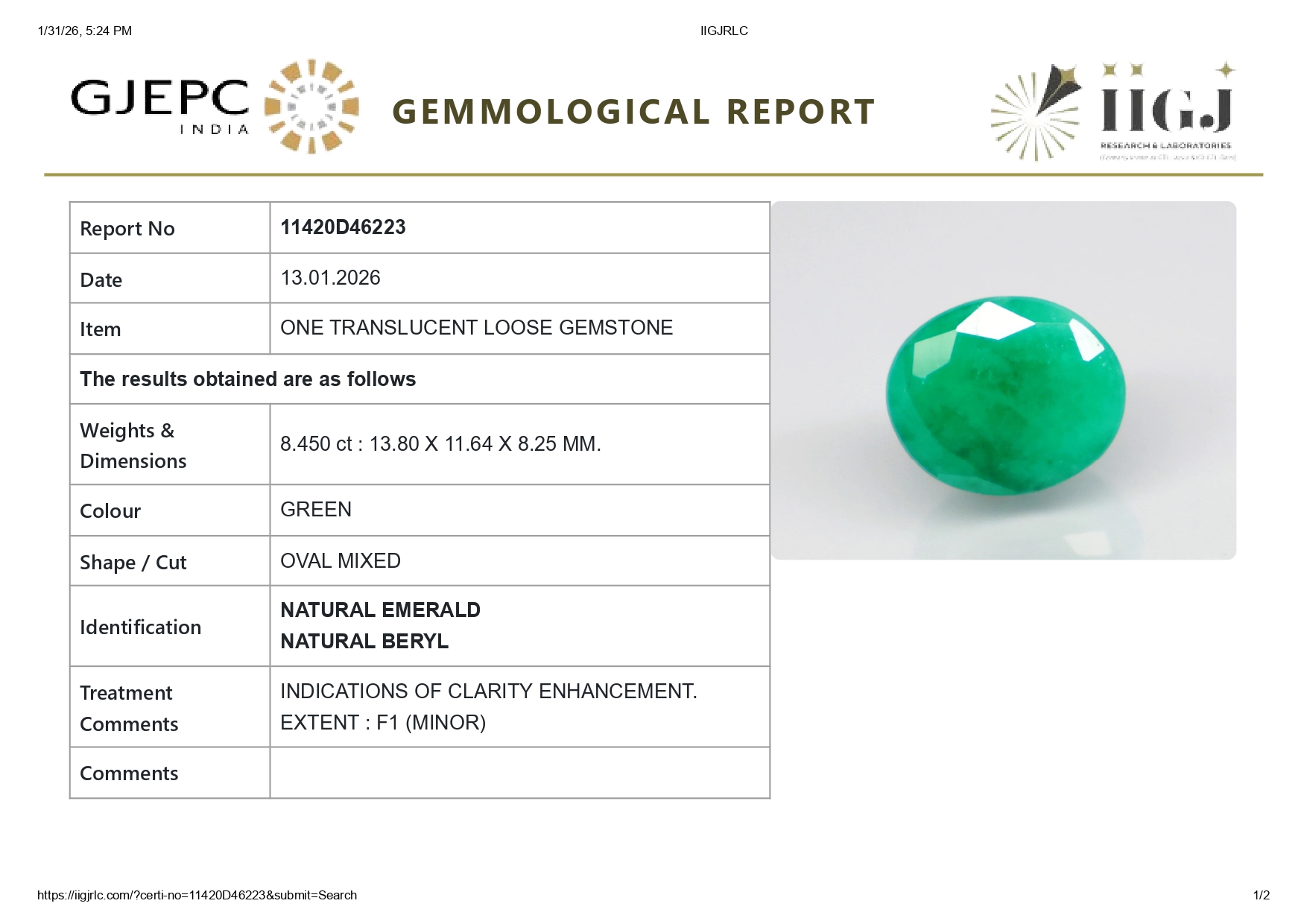 Buy one beautiful translucent 8.45 Carat/ 9.29 Ratti original Emerald online. It has a Oval shape and a clarity grade of eye clean (evaluated at eye level), medium Green color intensity, and an excellent polish. The origin of this emerald is Zambia. This emerald stone is unheated & untreated and certified from IIGJ Govt. lab.
