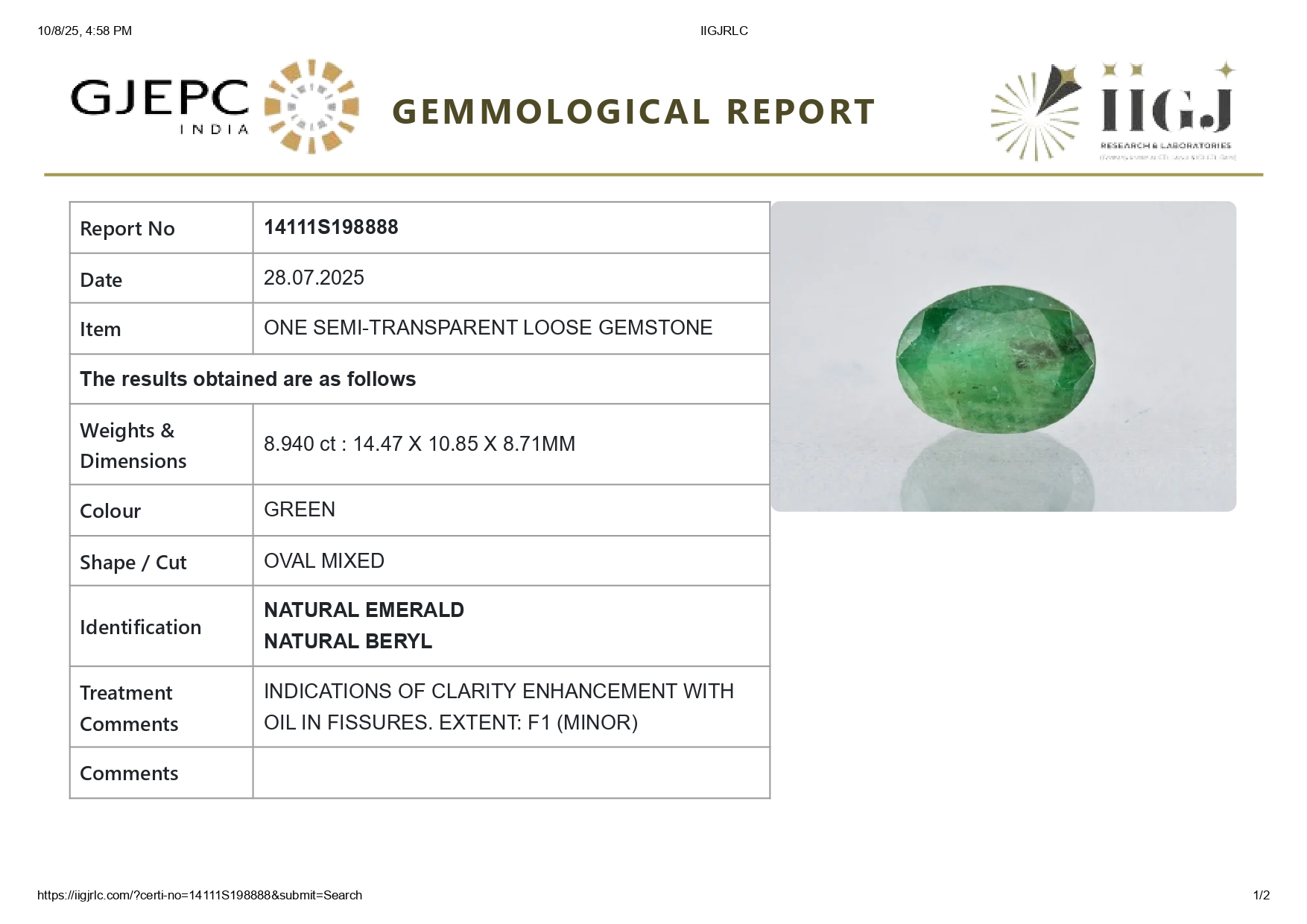 Buy one beautiful semi-transparent 8.94 Carat/ 9.82 Ratti original Emerald online. It has a oval shape and a clarity grade of eye clean (evaluated at eye level), medium Green color intensity, and an excellent polish. The origin of this emerald is Zambia. This emerald stone is unheated & untreated and certified from IIGJ Govt. Lab.