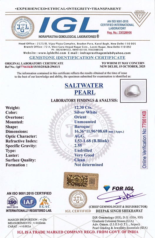 12.30 carats (13.52 Ratti) Venezuela Pearl (Moti Rashi Ratna) Certified by IGL for sale online. Venezuela Pearl is one of the top quality among all pearls and it has many benefits. After the basra pearl, Venezuela Pearl also considered one of the most powerful astrological importance in Vedic astrology, is worn to calm the planet Moon in the wearer's birth chart and is also extremely effective in Anger, Skin & Health.