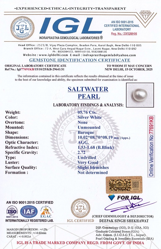 5.76 carats (6.33 Ratti) Venezuela Pearl (Moti Rashi Ratna) Certified by IGL for sale online. Venezuela Pearl is one of the top quality among all pearls and it has many benefits. After the basra pearl, Venezuela Pearl also considered one of the most powerful astrological importance in Vedic astrology, is worn to calm the planet Moon in the wearer's birth chart and is also extremely effective in Anger, Skin & Health.