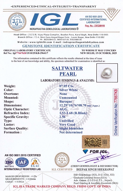 7.05 carats (7.75 Ratti) Venezuela Pearl (Moti Rashi Ratna) Certified by IGL for sale online. Venezuela Pearl is one of the top quality among all pearls and it has many benefits. After the basra pearl, Venezuela Pearl also considered one of the most powerful astrological importance in Vedic astrology, is worn to calm the planet Moon in the wearer's birth chart and is also extremely effective in Anger, Skin & Health.