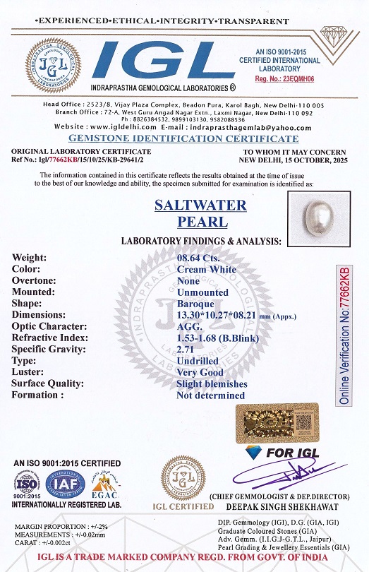8.64 carats (9.49 Ratti) Venezuela Pearl (Moti Rashi Ratna) Certified by IGL for sale online. Venezuela Pearl is one of the top quality among all pearls and it has many benefits. After the basra pearl, Venezuela Pearl also considered one of the most powerful astrological importance in Vedic astrology, is worn to calm the planet Moon in the wearer's birth chart and is also extremely effective in Anger, Skin & Health.