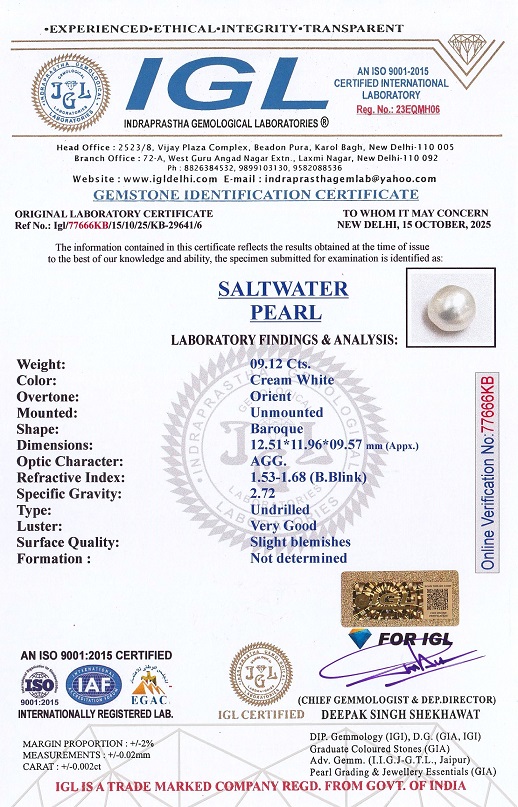 9.12 carats (10.02 Ratti) Venezuela Pearl (Moti Rashi Ratna) Certified by IGL for sale online. Venezuela Pearl is one of the top quality among all pearls and it has many benefits. After the basra pearl, Venezuela Pearl also considered one of the most powerful astrological importance in Vedic astrology, is worn to calm the planet Moon in the wearer's birth chart and is also extremely effective in Anger, Skin & Health.