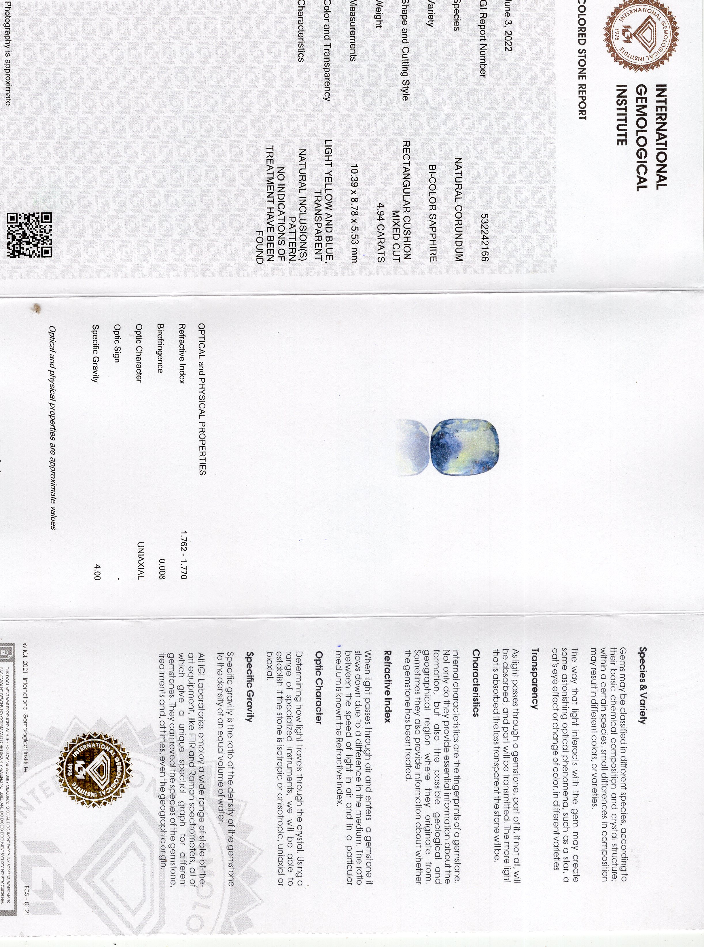 Buy 100% Natural and Original Pitambari Neelam for sale online 4.94 carats (5.43 Ratti). The Stone origin (where it is mined) is Sri-Lanka (Ceylon). The stone depicts the unification of two powerful yet slow-moving planets- Saturn and Jupiter.It is also known as Bi-colour sapphire/ Three color or combination of yellow sapphire blue sapphire and sometimes white sapphire also.