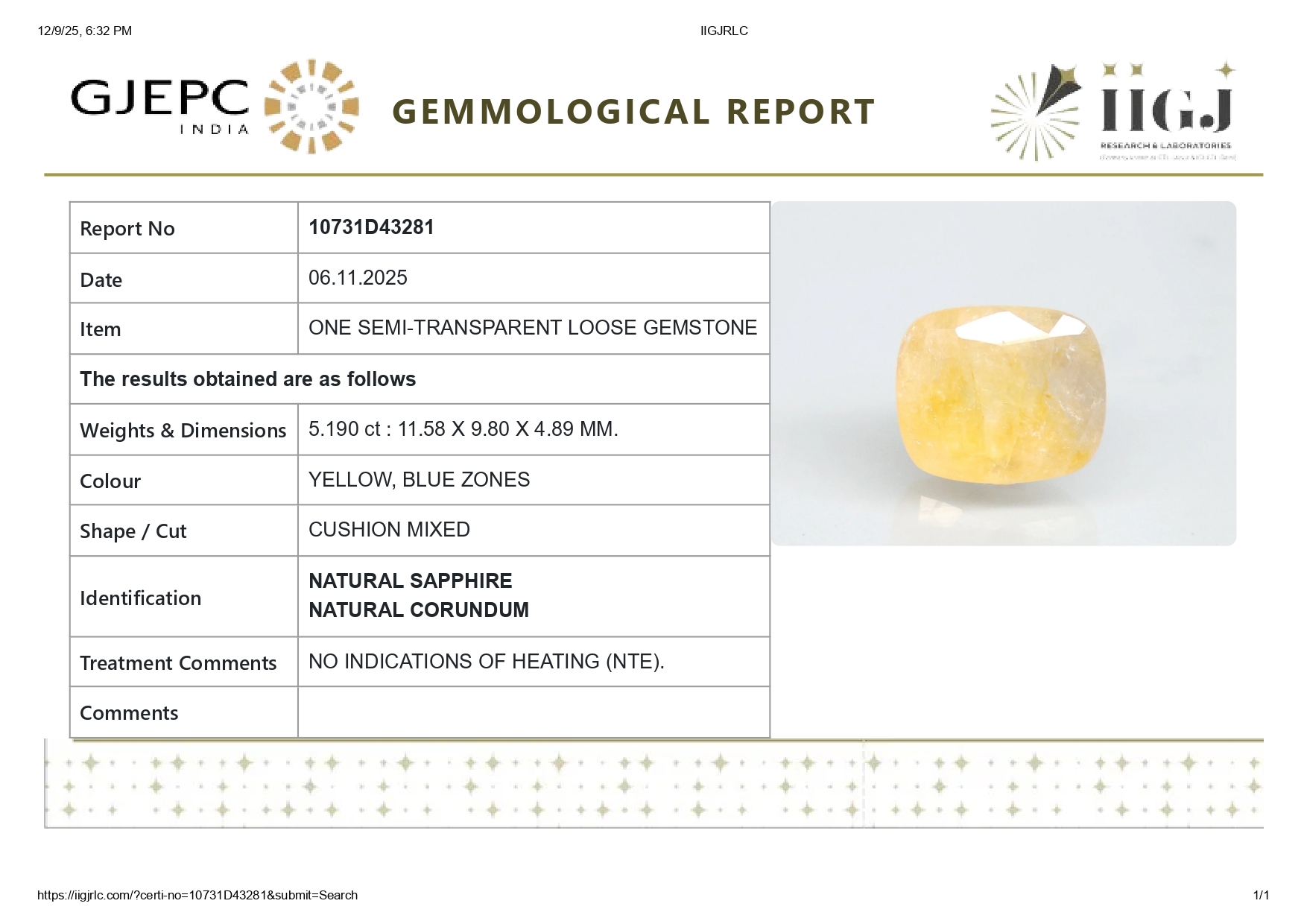 Govt Lab Certified - IIGJ (Formerly -IGI-GTL, Worth 1500/-)