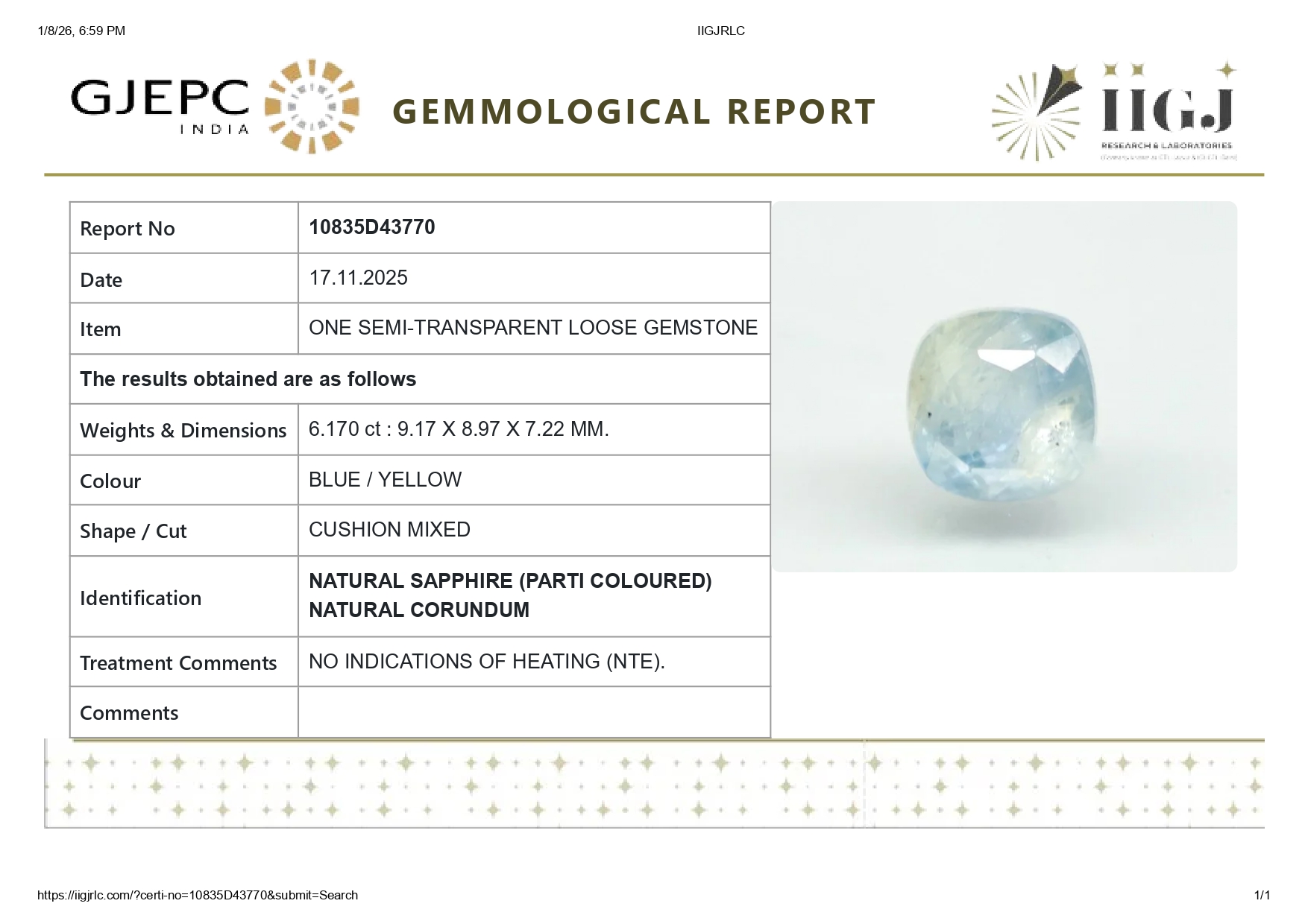 Buy 100% Natural and Original Pitambari Neelam for sale online 6.17 carats (6.78 Ratti). The Stone origin (where it is mined) is Sri-Lanka (Ceylon). The stone depicts the unification of two powerful yet slow-moving planets- Saturn and Jupiter.It is also known as Bi-colour sapphire/ Three color or combination of yellow sapphire blue sapphire and sometimes white sapphire also.