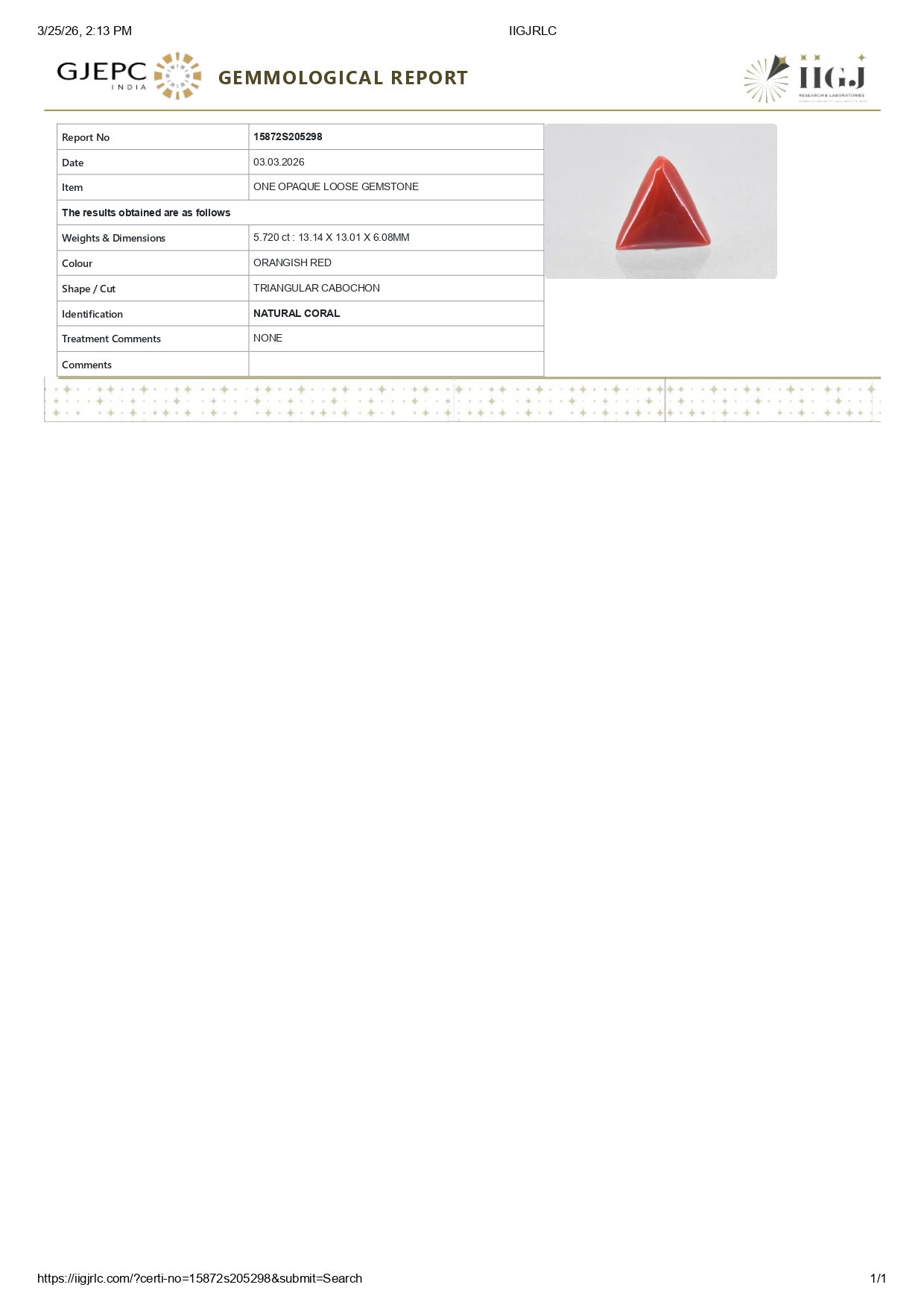 Buy 5.72 carats (6.29 Ratti) 100% natural Italian red coral (Moonga) stone online, directly imported from Italy (also called available"Italian Red Coral"). Moonga Stone is a source of enormous power & strength. Check out the exclusive inventory online all shapes (Triangular, Capsule & Oval) with a reputed IIGJ Certificate