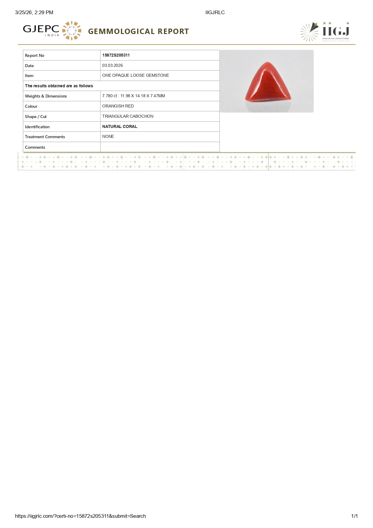 Buy 7.78 carats (8.55 Ratti) 100% natural Italian red coral (Moonga) stone online, directly imported from Italy (also called available"Italian Red Coral"). Moonga Stone is a source of enormous power & strength. Check out the exclusive inventory online all shapes (Triangular, Capsule & Oval) with a reputed IIGJ Certificate