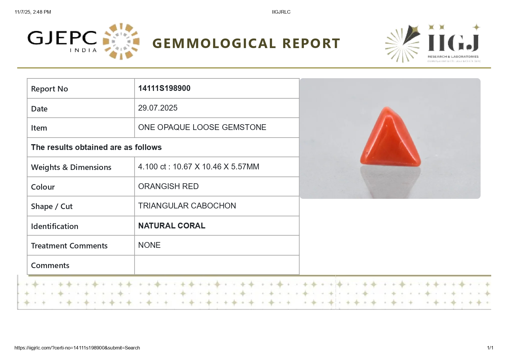 Buy 4.10 carats (4.51 Ratti) 100% natural Italian red coral (Moonga) stone online, directly imported from Italy (also called available"Italian Red Coral"). Moonga Stone is a source of enormous power & strength. Check out the exclusive inventory online all shapes (Triangular, Capsule & Oval) with a reputed IIGJ Certificate