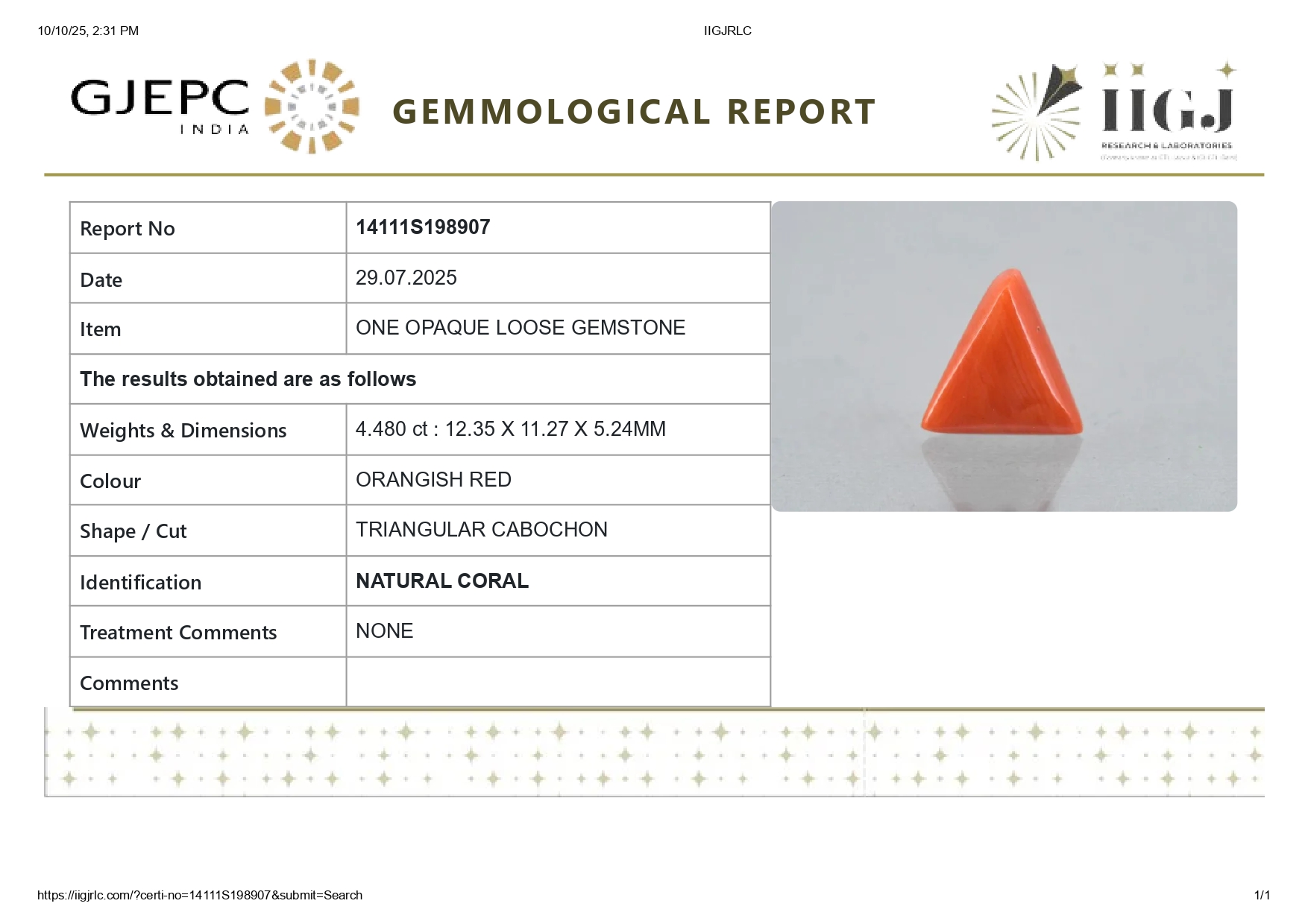 Buy 4.48 carats (4.92 Ratti) 100% natural Italian red coral (Moonga) stone online, directly imported from Italy (also called available"Italian Red Coral"). Moonga Stone is a source of enormous power & strength. Check out the exclusive inventory online all shapes (Triangular, Capsule & Oval) with a reputed IIGJ Certificate