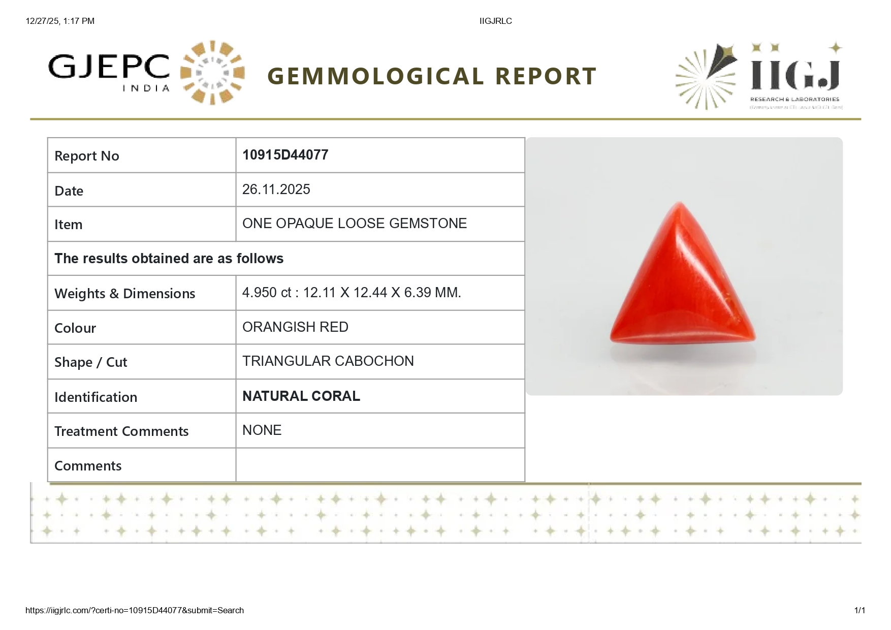 Buy 4.95 carats (5.44 Ratti) 100% natural Italian red coral (Moonga) stone online, directly imported from Italy (also called available"Italian Red Coral"). Moonga Stone is a source of enormous power & strength. Check out the exclusive inventory online all shapes (Triangular, Capsule & Oval) with a reputed IIGJ Certificate
