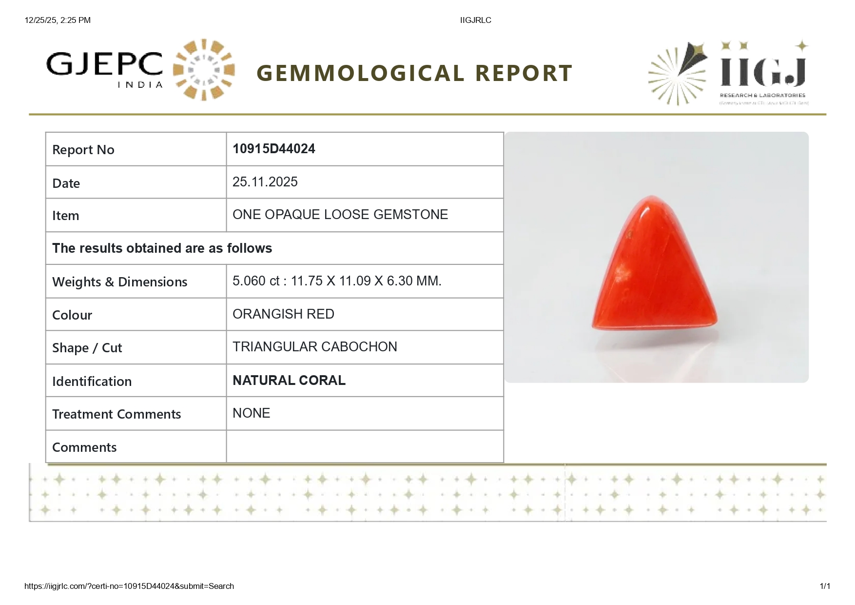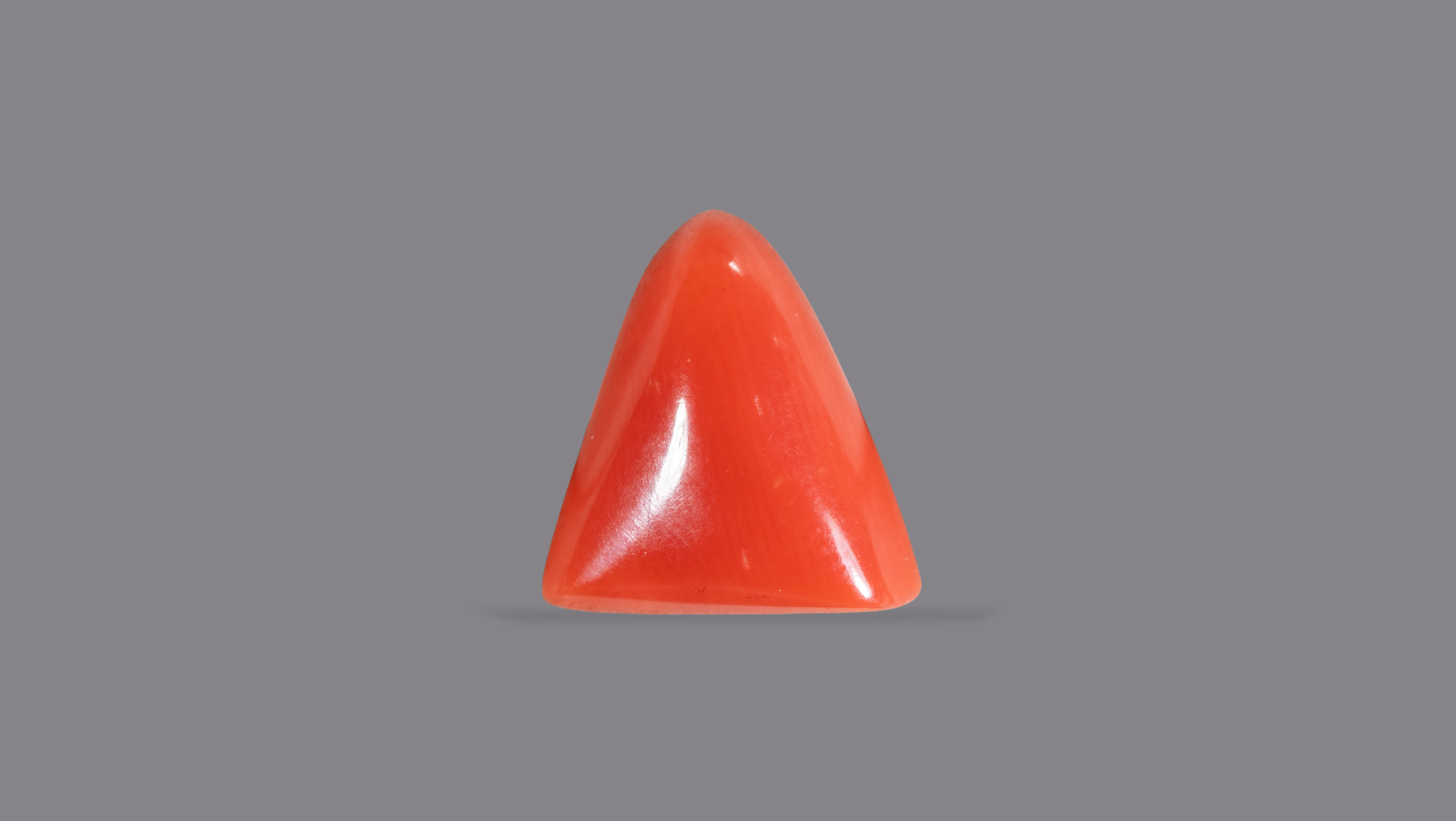 Buy 5.06 carats (5.56 Ratti) 100% natural Italian red coral (Moonga) stone online, directly imported from Italy (also called available"Italian Red Coral"). Moonga Stone is a source of enormous power & strength. Check out the exclusive inventory online all shapes (Triangular, Capsule & Oval) with a reputed IIGJ Certificate