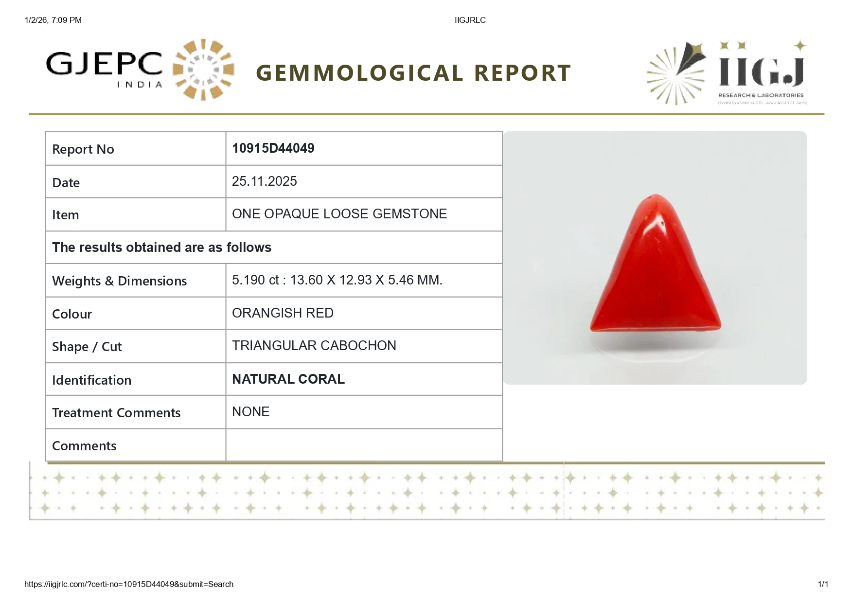 Buy 5.19 carats (5.70 Ratti) 100% natural Italian red coral (Moonga) stone online, directly imported from Italy (also called available"Italian Red Coral"). Moonga Stone is a source of enormous power & strength. Check out the exclusive inventory online all shapes (Triangular, Capsule & Oval) with a reputed IIGJ Certificate
