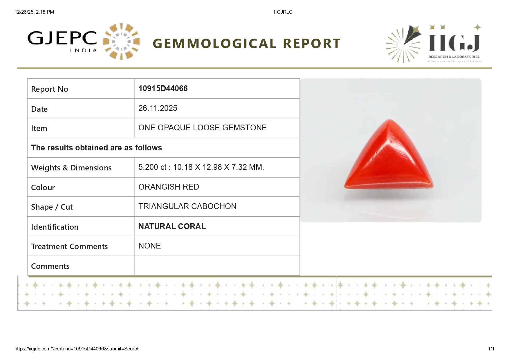 Buy 5.20 carats (5.71 Ratti) 100% natural Italian red coral (Moonga) stone online, directly imported from Italy (also called available"Italian Red Coral"). Moonga Stone is a source of enormous power & strength. Check out the exclusive inventory online all shapes (Triangular, Capsule & Oval) with a reputed IIGJ Certificate