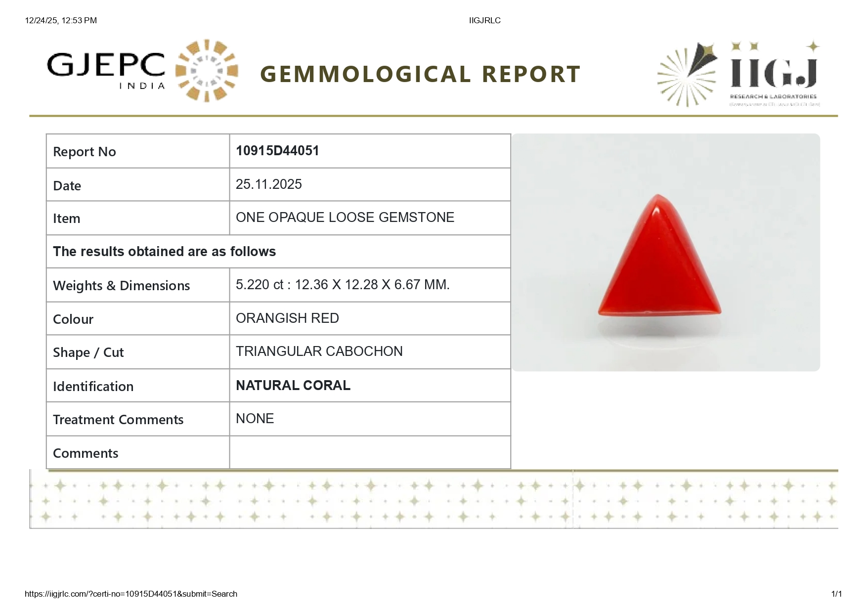 Buy 5.22 carats (5.74 Ratti) 100% natural Italian red coral (Moonga) stone online, directly imported from Italy (also called available"Italian Red Coral"). Moonga Stone is a source of enormous power & strength. Check out the exclusive inventory online all shapes (Triangular, Capsule & Oval) with a reputed IIGJ Certificate
