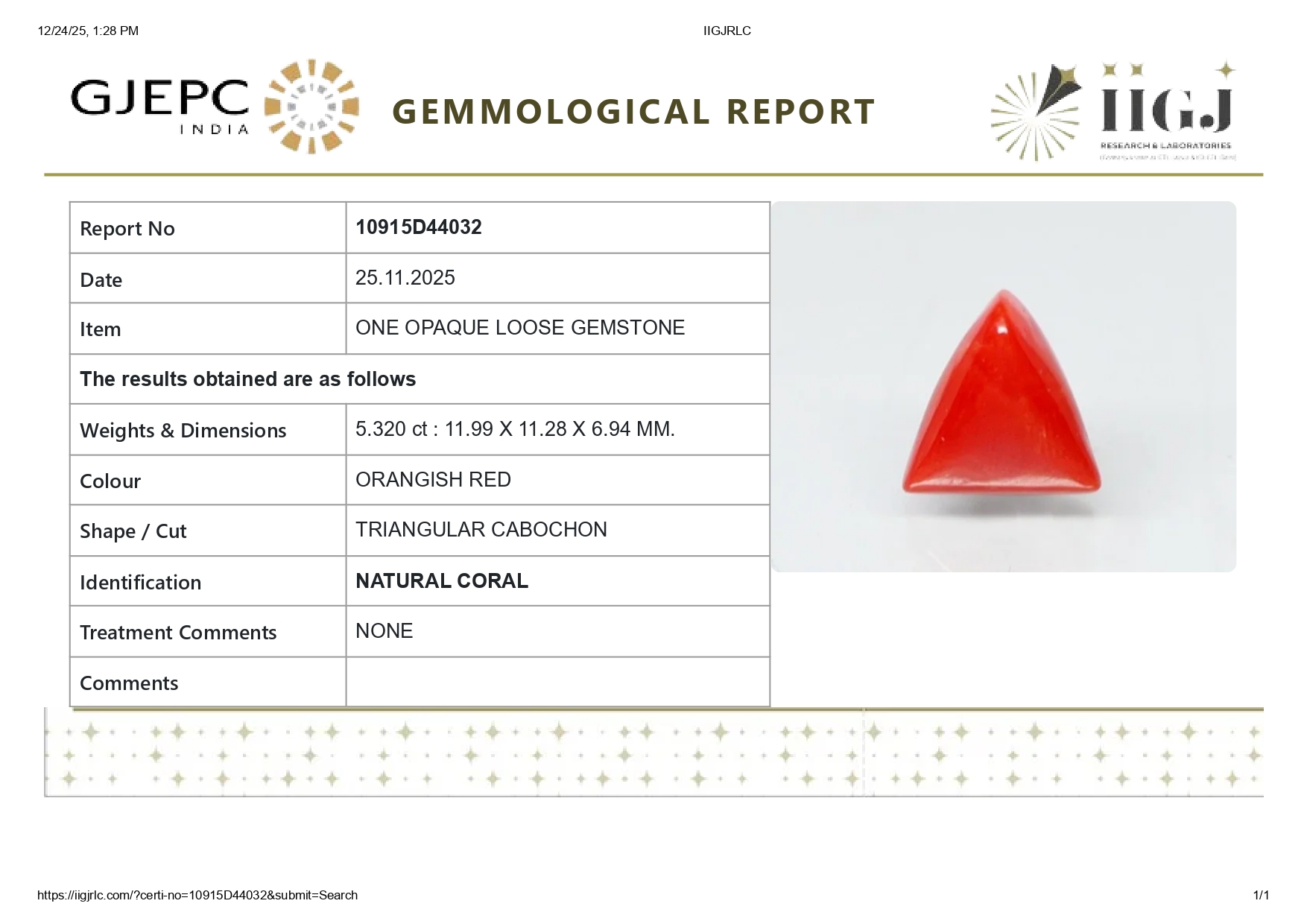 Buy 5.32 carats (5.85 Ratti) 100% natural Italian red coral (Moonga) stone online, directly imported from Italy (also called available"Italian Red Coral"). Moonga Stone is a source of enormous power & strength. Check out the exclusive inventory online all shapes (Triangular, Capsule & Oval) with a reputed IIGJ Certificate
