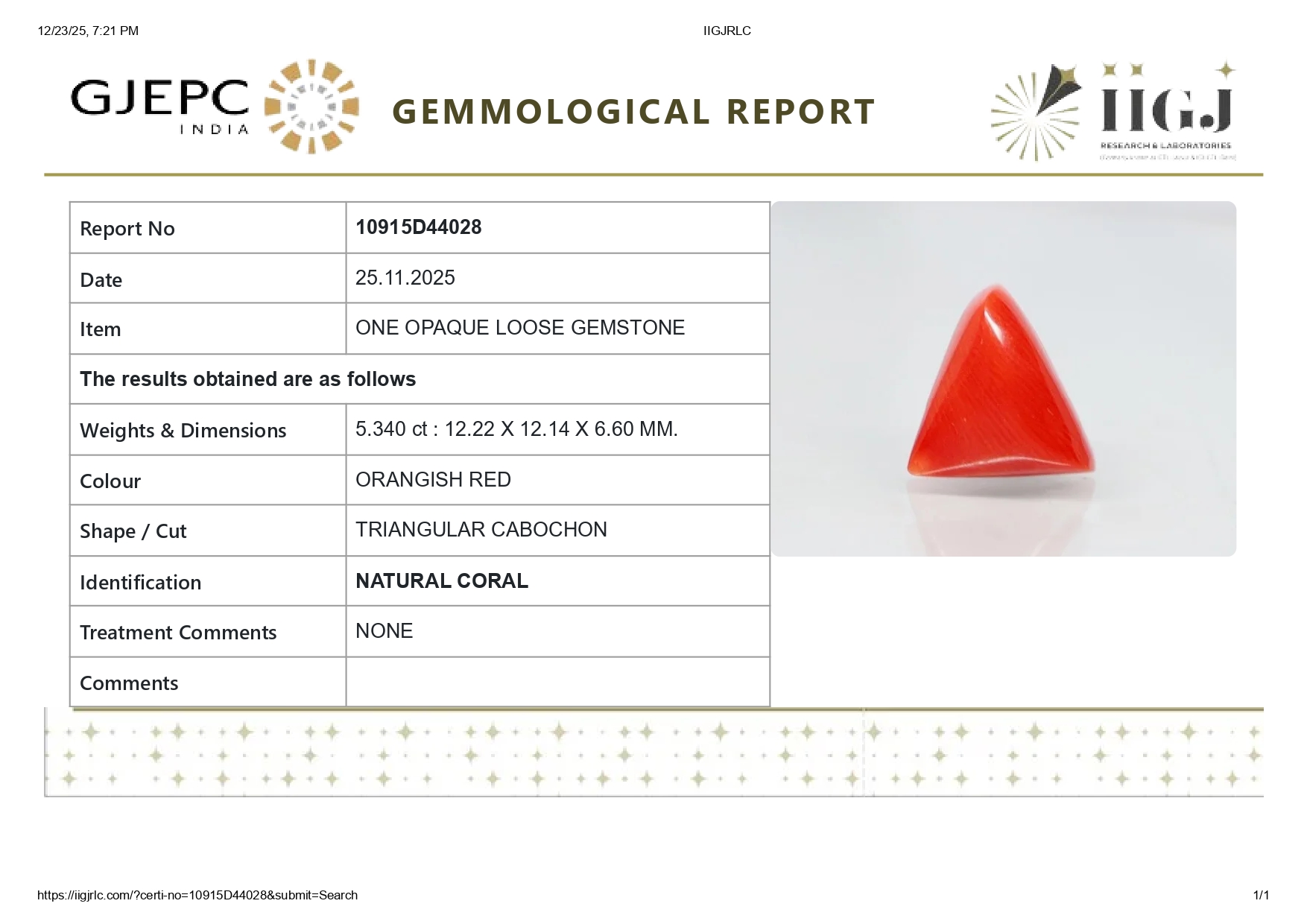 Buy 5.34 carats (5.87 Ratti) 100% natural Italian red coral (Moonga) stone online, directly imported from Italy (also called available"Italian Red Coral"). Moonga Stone is a source of enormous power & strength. Check out the exclusive inventory online all shapes (Triangular, Capsule & Oval) with a reputed IIGJ Certificate